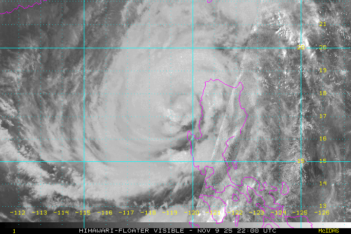 - 22:00 ไต้ฝุ่น “ฟงวอง” Fung-wong 鳳凰 ในทะเลจีนใต้ อ่อนกำลังลงเป็นพายุโซนร้อนกำลังแรง ความเร็วลมใกล้ศูนย์กลางลดลงเหลือ 60 น็อต ความกดอากาศ 975 hPa พิกัดล่าสุดอยู่ที่ 18.5°N 118.3°E แนวโน้มเคลื่อนตัวขึ้นฝั่งไต้หวันในวันที่ 12 พ.ย.
