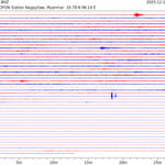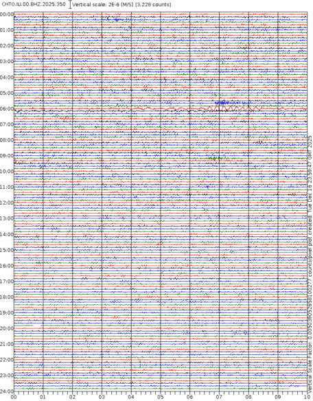 - 06:44 กราฟแผ่นดินไหว ช่วง 24 ชั่วโมงที่ผ่านมา บันทึกจากสถานีกรุงเนปิดอว์ ประเทศพม่า (กราฟนี้เน้นใช้ประโยชน์เรื่องของเวลาที่เกิดแผ่นดินไหว โดยแยกสีเป็นแดงน้ำเงินสีละครึ่งชั่วโมงเพื่อให้ดูง่าย ส่วนเรื่องขนาดแผ่นดินไหว กราฟนี้ไม่อาจใช้ระบุตัวเลขที่ชัดเจน)