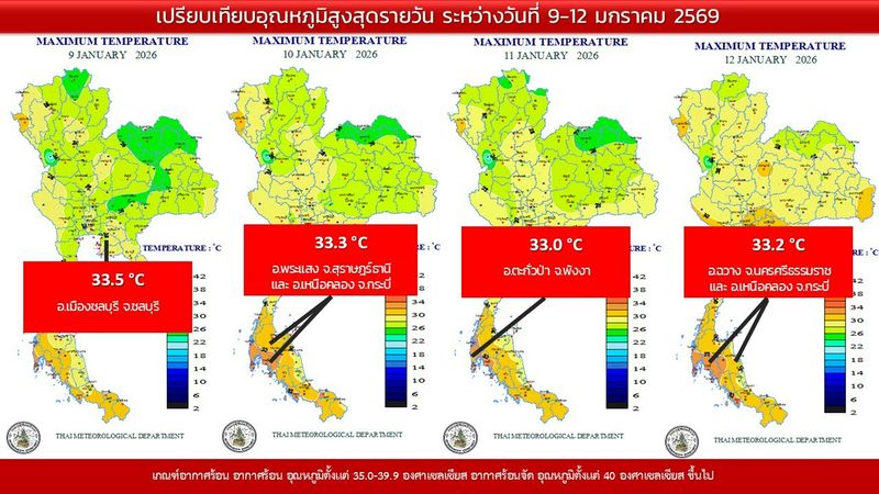 - 07:00 แผนที่เปรียบเทียบอุณหภูมิต่ำสุดในประเทศไทยรอบ 24 ชั่วโมงย้อนหลัง 4 วัน