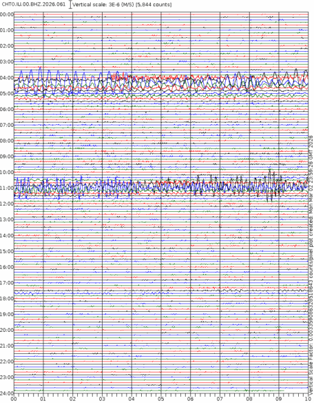 - 06:59 กราฟแผ่นดินไหวชนิดที่ใช้ดูเวลาเกิดเหตุเป็นหลัก แสดงภาพตามแนวตั้ง (BHZ) จากสถานีเครือข่าย IRIS สาขาเชียงใหม่ (CHTO) จาก 07:00 เช้าเมื่อวานนี้จนถึงเวลานี้ เส้นกราฟตามแนวนอนเส้นละ 10 นาที แยกสีเส้นกราฟเพื่อให้ดูได้ง่าย ช่องแบ่งตามแนวตั้งช่องละ 1 นาที