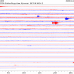 - 05:37 กราฟแผ่นดินไหว ช่วง 24 ชั่วโมงที่ผ่านมา บันทึกจากสถานีกรุงเนปิดอว์ ประเทศพม่า (กราฟนี้เน้นใช้ประโยชน์เรื่องของเวลาที่เกิดแผ่นดินไหว โดยแยกสีเป็นแดงน้ำเงินสีละครึ่งชั่วโมงเพื่อให้ดูง่าย ส่วนเรื่องขนาดแผ่นดินไหว กราฟนี้ไม่อาจใช้ระบุตัวเลขที่ชัดเจน)