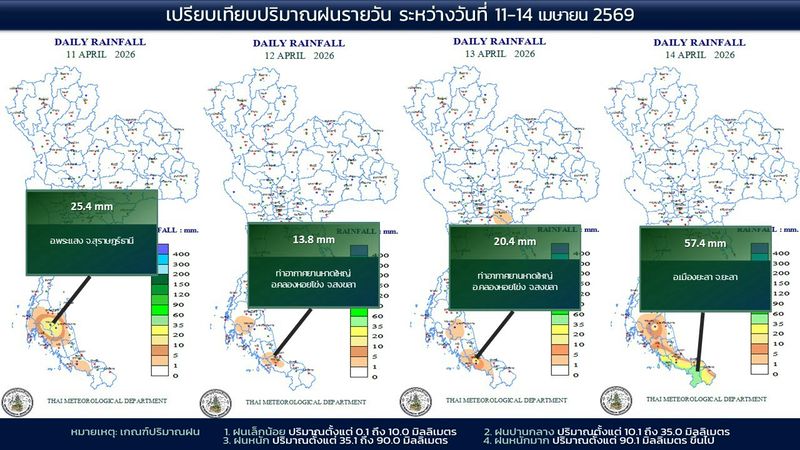 - 07:00 แผนที่เปรียบเทียบพื้นที่ที่มีปริมาณฝนสูงสุดในประเทศไทยรอบ 24 ชั่วโมงย้อนหลัง 4 วัน
