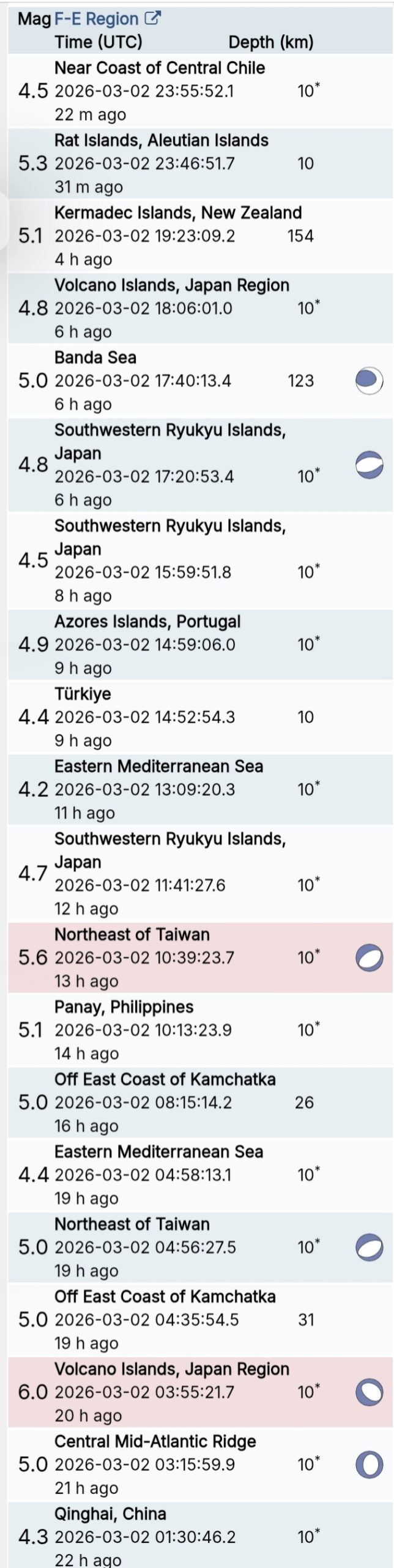 สรุปรายการแผ่นดินไหวและอาฟเตอร์ช็อกทั่วโลกจาก Geofon เยอรมนี ช่วง 07:00 เมื่อวานนี้ ถึง 07:00 เช้าวันนี้ (เวลาในตารางเป็น UTC ต้องบวก 7 ชั่วโมงให้เป็นเวลาไทย)