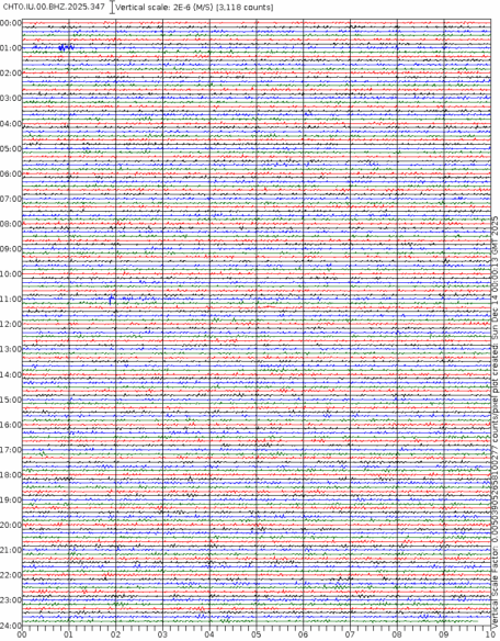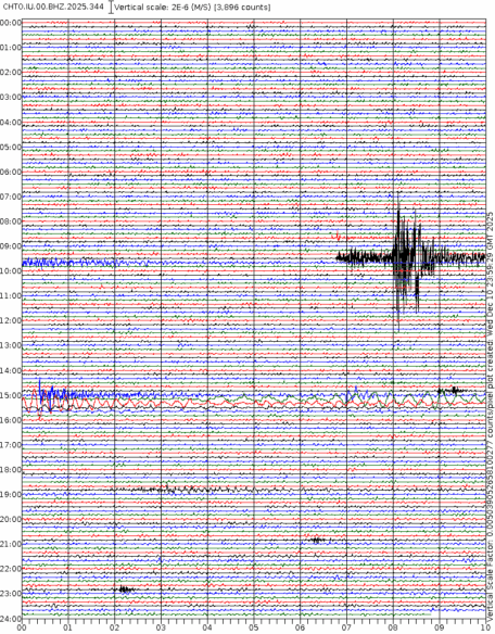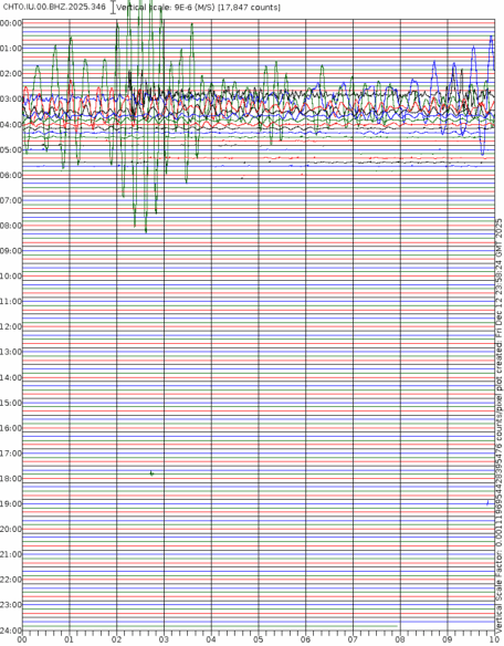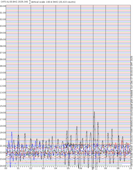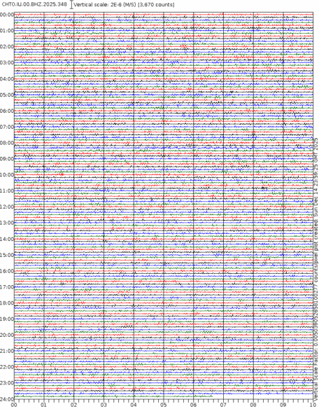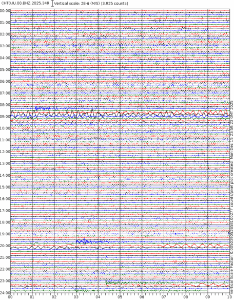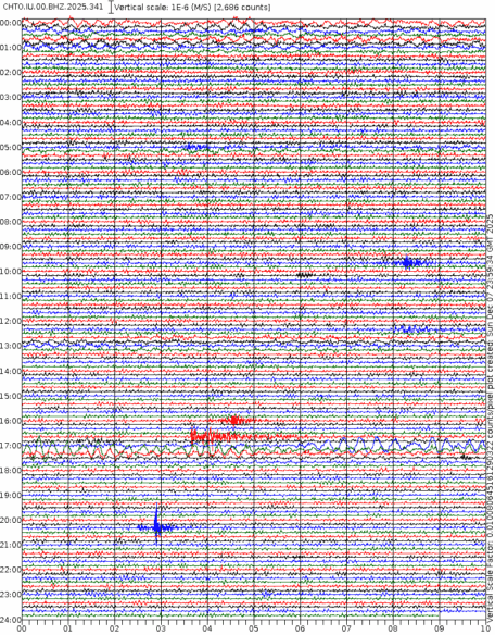 - 06:59 กราฟแผ่นดินไหวชนิดที่ใช้ดูเวลาเกิดเหตุเป็นหลัก แสดงภาพตามแนวตั้ง (BHZ) จากสถานีเครือข่าย IRIS สาขาเชียงใหม่ (CHTO) จาก 07:00 เช้าเมื่อวานนี้จนถึงเวลานี้ เส้นกราฟตามแนวนอนเส้นละ 10 นาที แยกสีเส้นกราฟเพื่อให้ดูได้ง่าย ช่องแบ่งตามแนวตั้งช่องละ 1 นาที