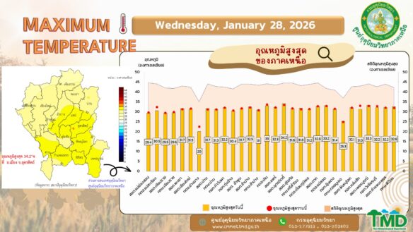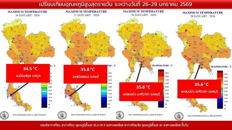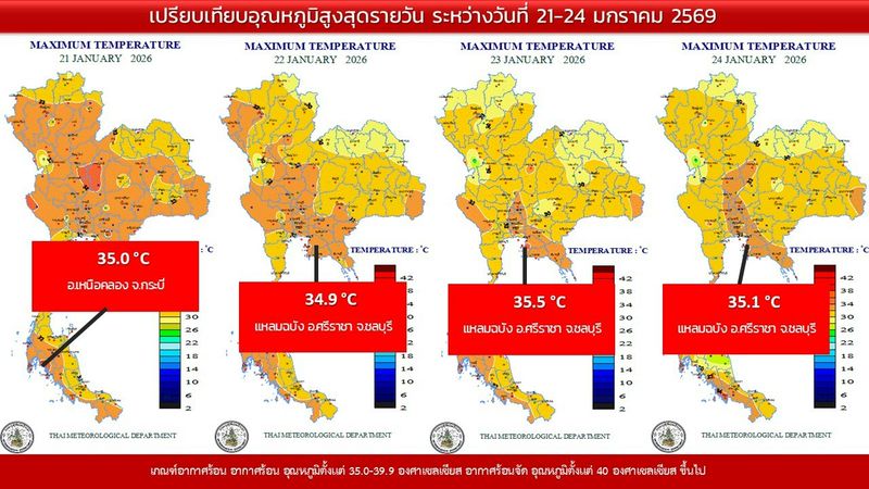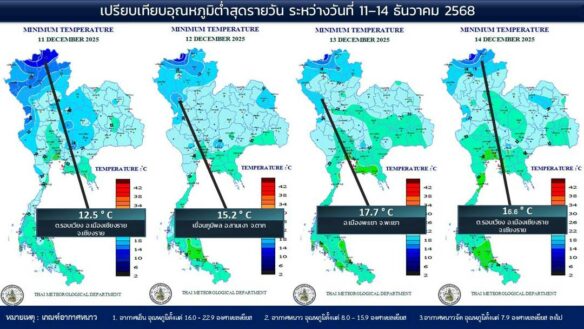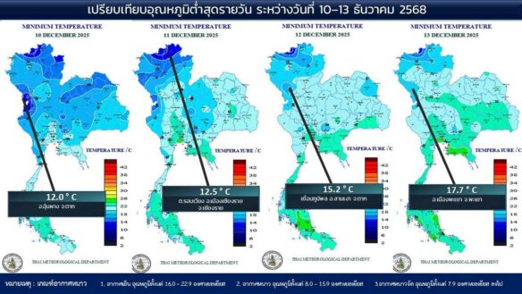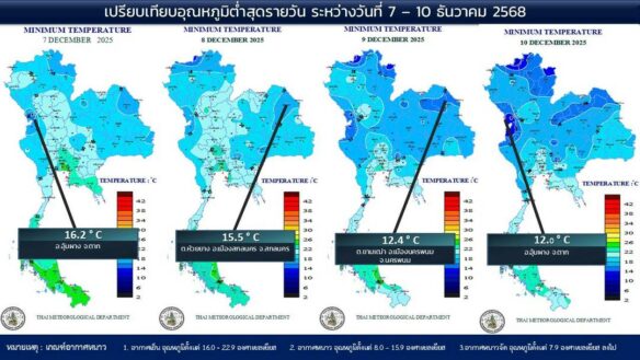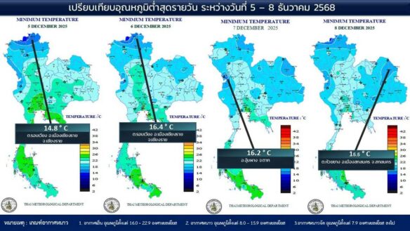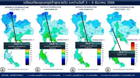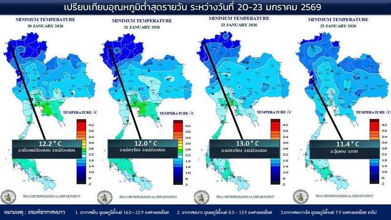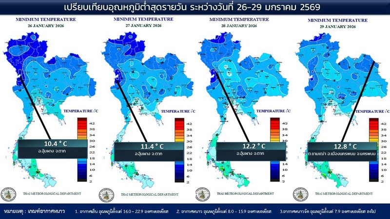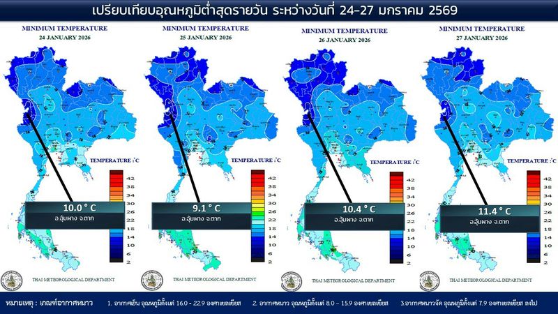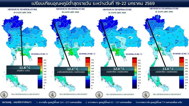 - 07:00 แผนที่เปรียบเทียบอุณหภูมิต่ำสุดในประเทศไทยรอบ 24 ชั่วโมงย้อนหลัง 4 วัน