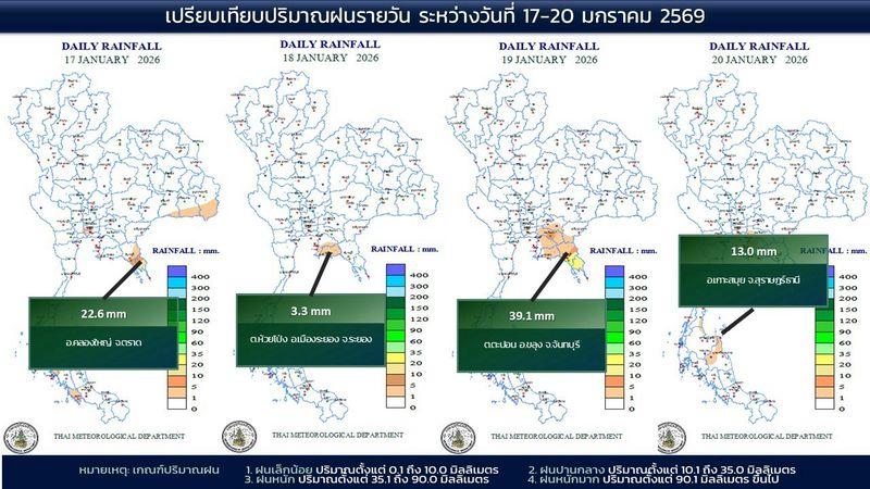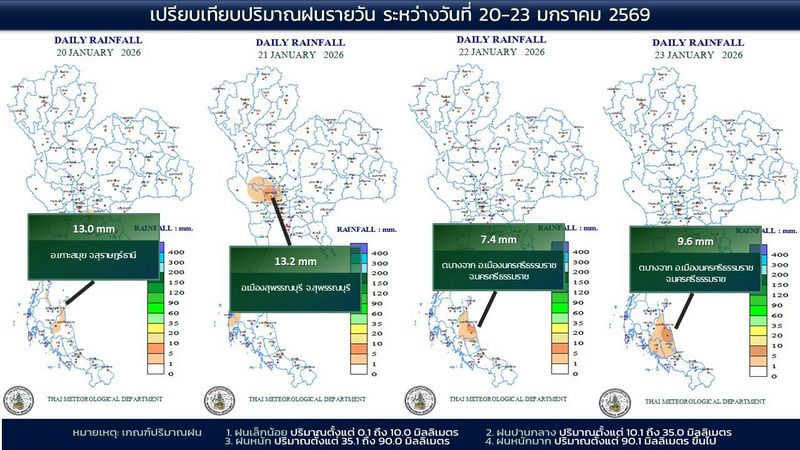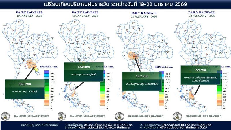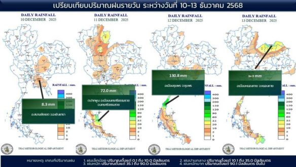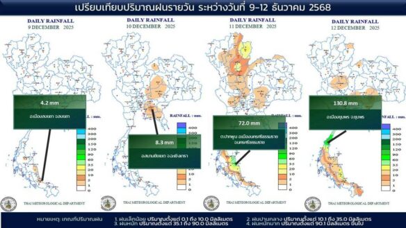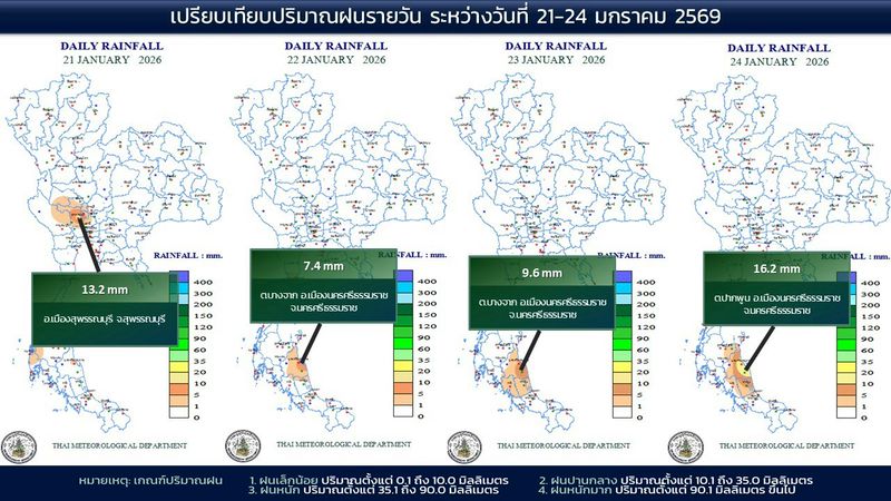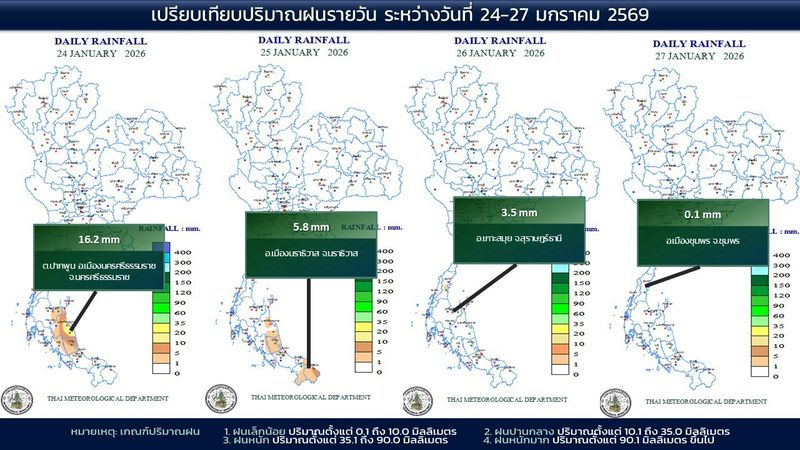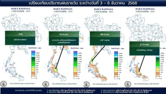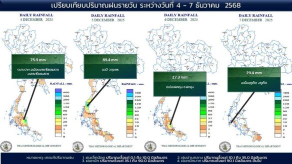 - 07:00 แผนที่เปรียบเทียบพื้นที่ที่มีปริมาณฝนสูงสุดในประเทศไทยรอบ 24 ชั่วโมงย้อนหลัง 4 วัน