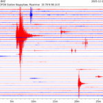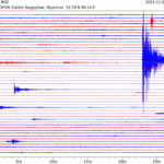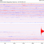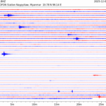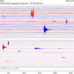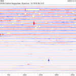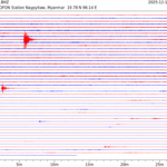 - 06:44 กราฟแผ่นดินไหว ช่วง 24 ชั่วโมงที่ผ่านมา บันทึกจากสถานีกรุงเนปิดอว์ ประเทศพม่า (กราฟนี้เน้นใช้ประโยชน์เรื่องของเวลาที่เกิดแผ่นดินไหว โดยแยกสีเป็นแดงน้ำเงินสีละครึ่งชั่วโมงเพื่อให้ดูง่าย ส่วนเรื่องขนาดแผ่นดินไหว กราฟนี้ไม่อาจใช้ระบุตัวเลขที่ชัดเจน)
