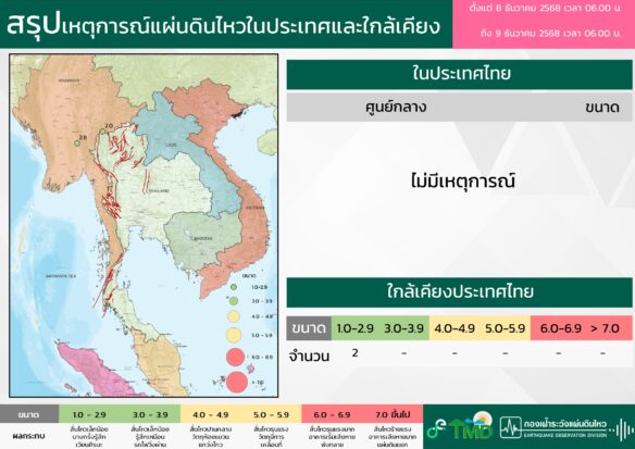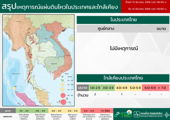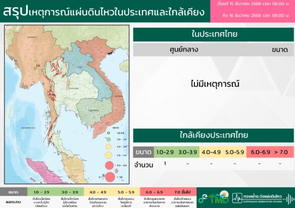 - 06:00 สรุปเหตุการณ์แผ่นดินไหวในประเทศไทยและเพื่อนบ้านตลอด 24 ชั่วโมงที่ผ่านมาที่ตรวจวัดได้โดยกรมอุตุฯ