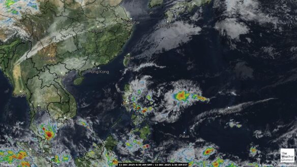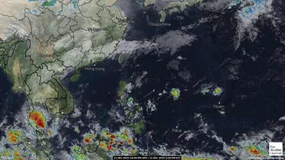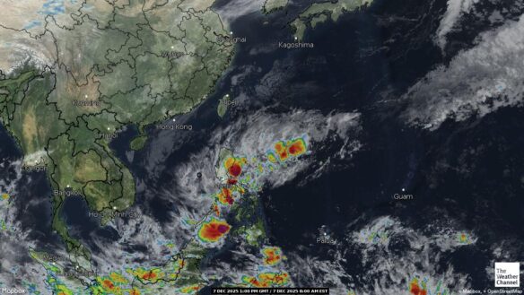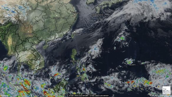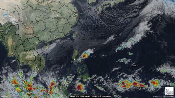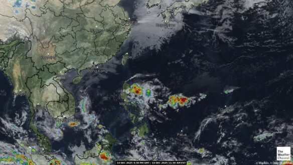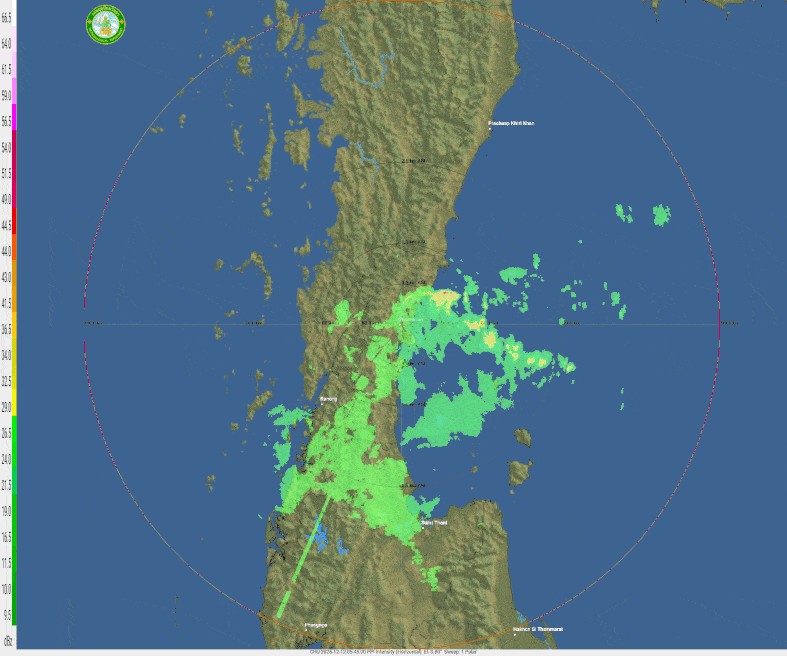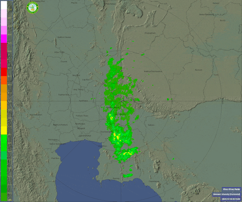 - 07:00 ภาพดาวเทียมย้อมสีจาก TWC แสดงกลุ่มฝนในเอเชียตะวันออกเฉียงใต้และโซนตะวันตกของมหาสมุทรแปซิฟิกเวลานี้