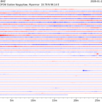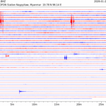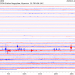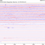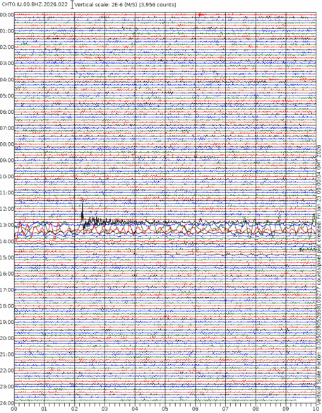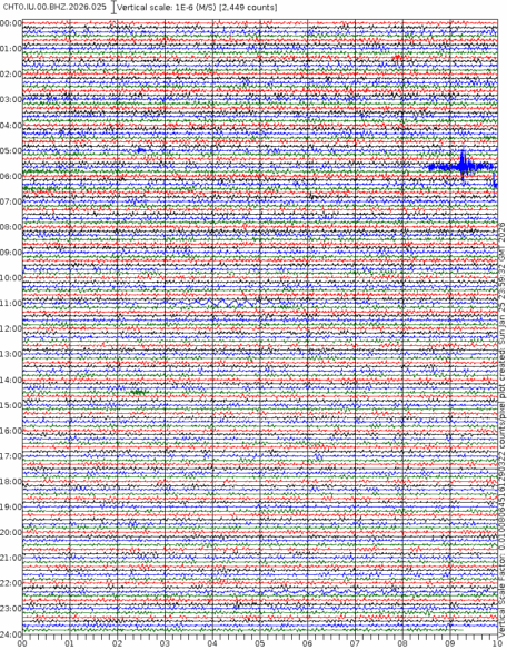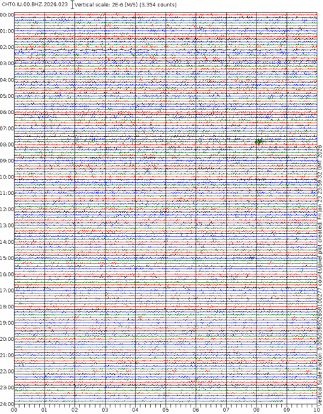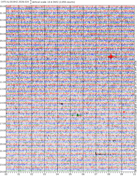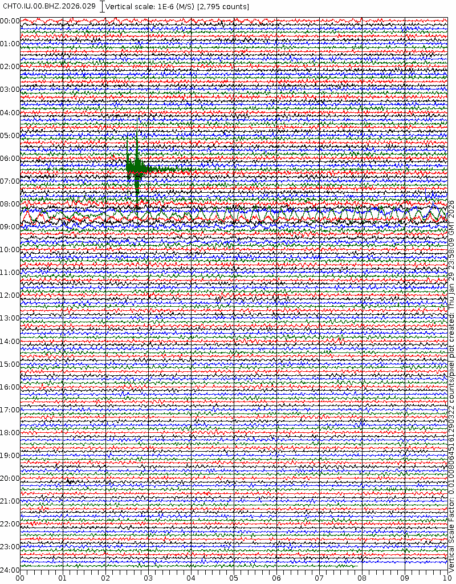 - 06:57 กราฟแผ่นดินไหวชนิดที่ใช้ดูเวลาเกิดเหตุเป็นหลัก แสดงภาพตามแนวตั้ง (BHZ) จากสถานีเครือข่าย IRIS สาขาเชียงใหม่ (CHTO) จาก 07:00 เช้าเมื่อวานนี้จนถึงเวลานี้ เส้นกราฟตามแนวนอนเส้นละ 10 นาที แยกสีเส้นกราฟเพื่อให้ดูได้ง่าย ช่องแบ่งตามแนวตั้งช่องละ 1 นาที