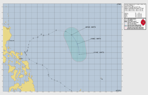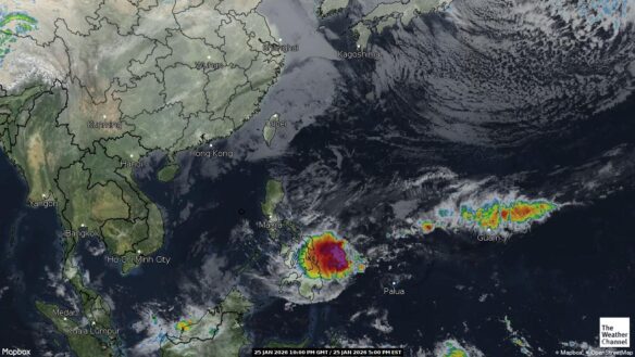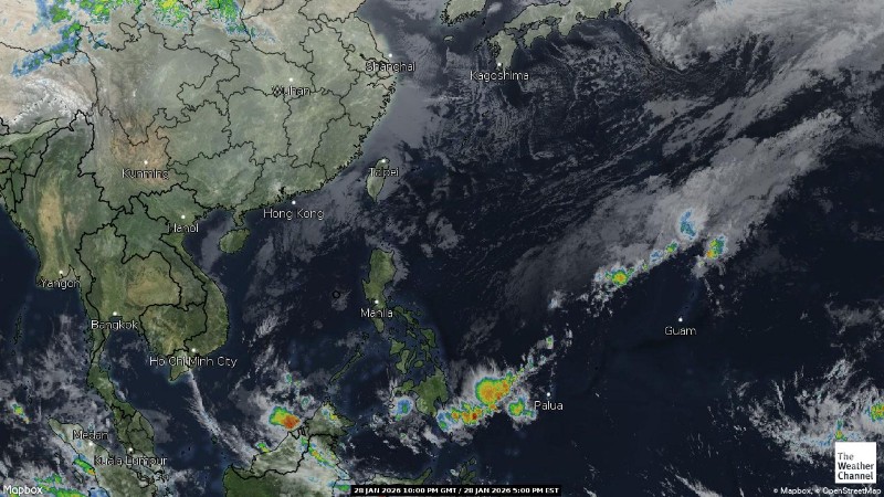 - 05:00 ภาพดาวเทียมย้อมสีจาก TWC แสดงกลุ่มฝนในเอเชียตะวันออกเฉียงใต้และโซนตะวันตกของมหาสมุทรแปซิฟิกเวลานี้