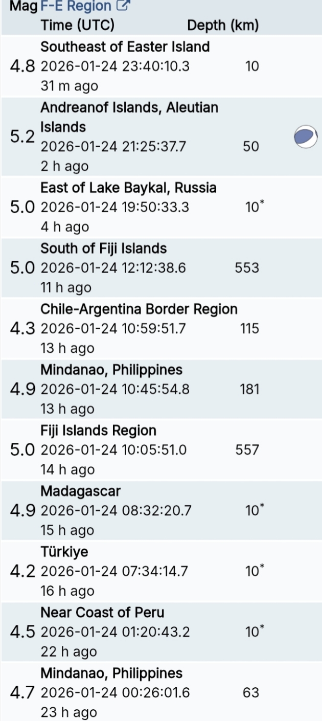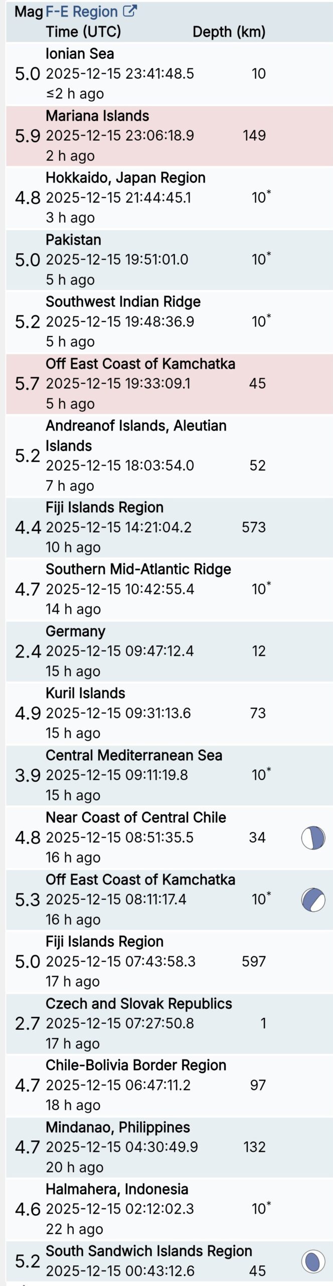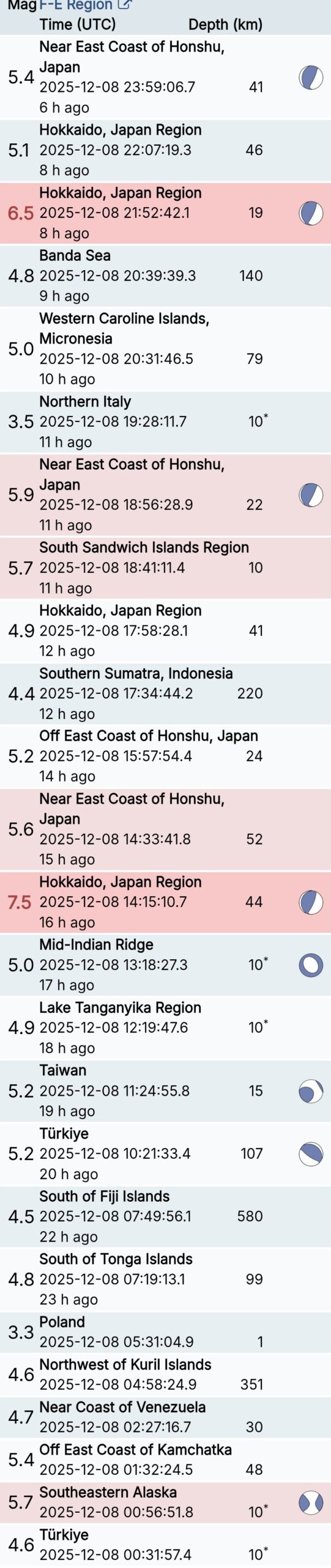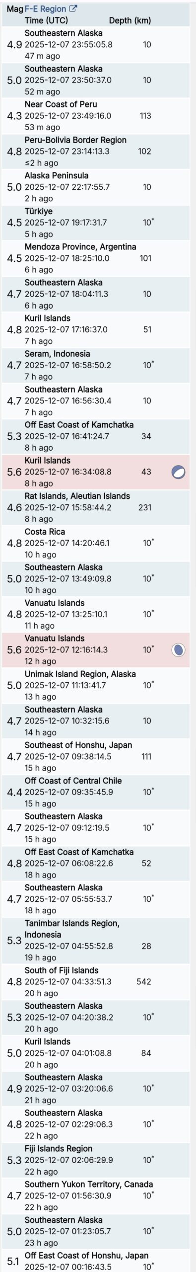 สรุปรายการแผ่นดินไหวและอาฟเตอร์ช็อกทั่วโลกจาก Geofon เยอรมนี ช่วง 07:00 เมื่อวานนี้ ถึง 07:00 เช้าวันนี้ (เวลาในตารางเป็น UTC ต้องบวก 7 ชั่วโมงให้เป็นเวลาไทย)