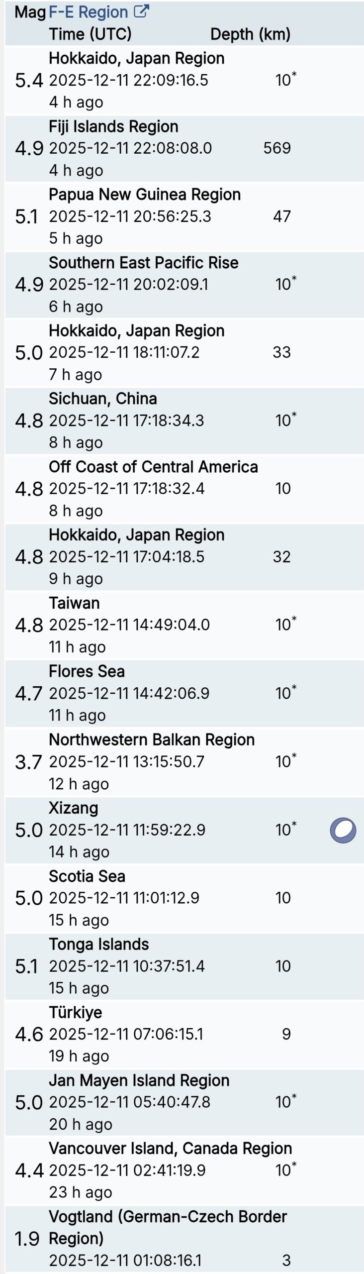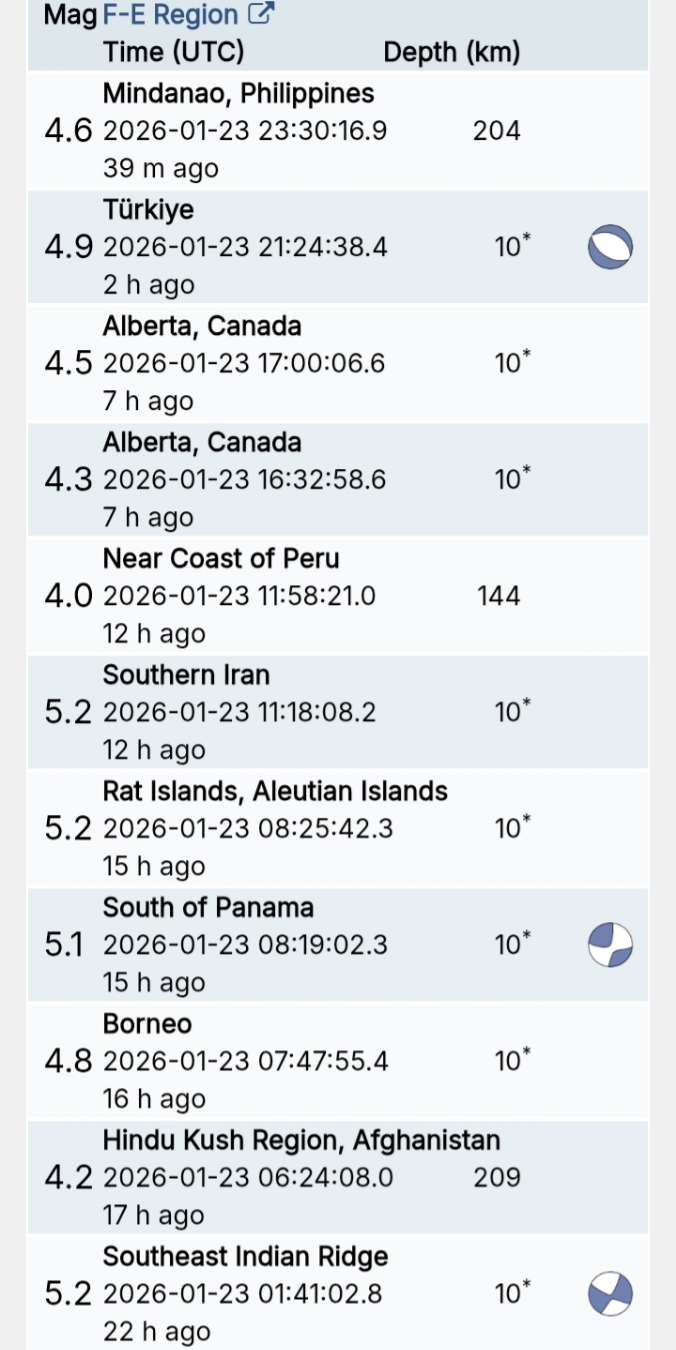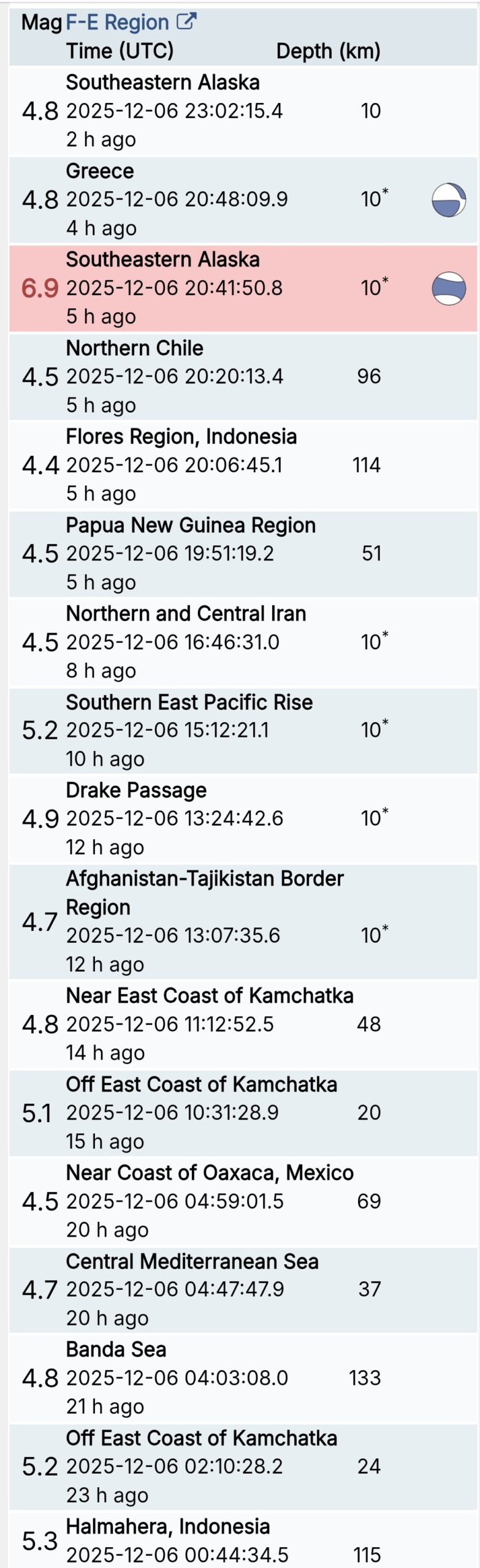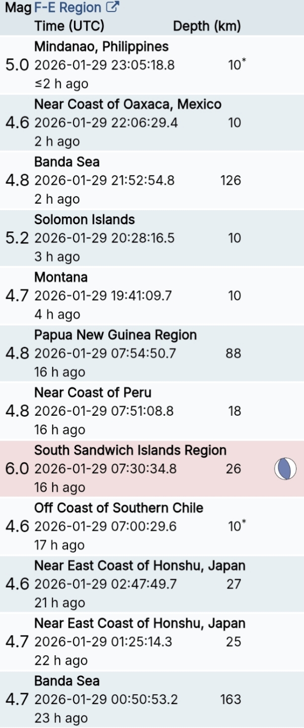 สรุปรายการแผ่นดินไหวและอาฟเตอร์ช็อกทั่วโลกจาก Geofon เยอรมนี ช่วง 07:00 เมื่อวานนี้ ถึง 07:00 เช้าวันนี้ (เวลาในตารางเป็น UTC ต้องบวก 7 ชั่วโมงให้เป็นเวลาไทย)