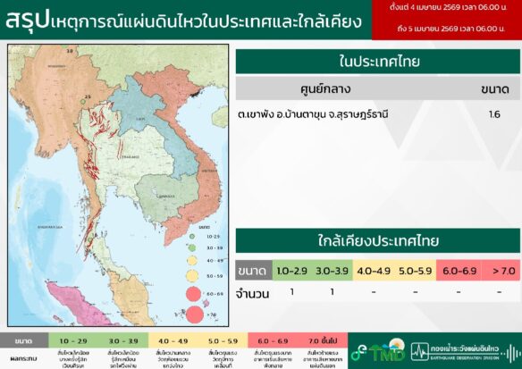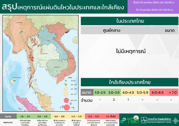• 06:00 สรุปเหตุการณ์แผ่นดินไหวในประเทศไทยและเพื่อนบ้านตลอด 24 ชั่วโมงที่ผ่านมาที่ตรวจวัดได้โดยกรมอุตุฯ