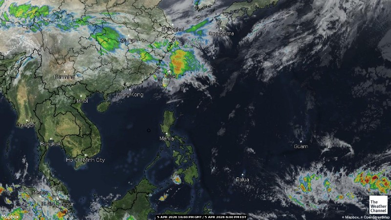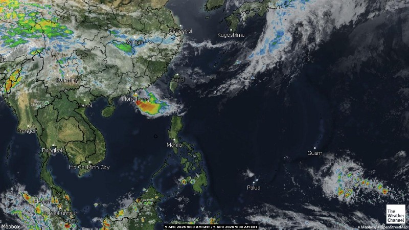 • 05:00 ภาพดาวเทียมย้อมสีจาก TWC แสดงกลุ่มฝนในเอเชียตะวันออกเฉียงใต้และโซนตะวันตกของมหาสมุทรแปซิฟิกเวลานี้