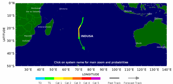 • 13:00 พายุดีเปรสชัน 29S ก่อตัวขึ้นในมหาสมุทรอินเดียโซนซีกโลกใต้ ทวีกำลังเป็นพายุโซนร้อน ได้ชื่อเรียกว่า INDUSA ทวีกำลังต่อเนื่องจนเป็นพายุไซโคลน จากนั้นอ่อนกำลังลงเป็นพายุโซนร้อนอีกครั้ง พิกัดล่าสุดอยู่ที่ 27.6 S 70.4 E ความเร็วลมใกล้ศูนย์กลาง 60 น็อต เคลื่อนตัวลงทางใต้ ไม่มีแนวโน้มขึ้นฝั่ง
