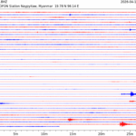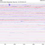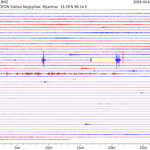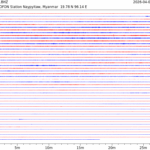 • 07:38 กราฟแผ่นดินไหว ช่วง 24 ชั่วโมงที่ผ่านมา บันทึกจากสถานีกรุงเนปิดอว์ ประเทศพม่า (กราฟนี้เน้นใช้ประโยชน์เรื่องของเวลาที่เกิดแผ่นดินไหว โดยแยกสีเป็นแดงน้ำเงินสีละครึ่งชั่วโมงเพื่อให้ดูง่าย ส่วนเรื่องขนาดแผ่นดินไหว กราฟนี้ไม่อาจใช้ระบุตัวเลขที่ชัดเจน)