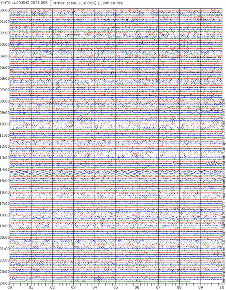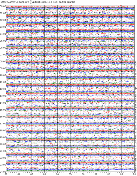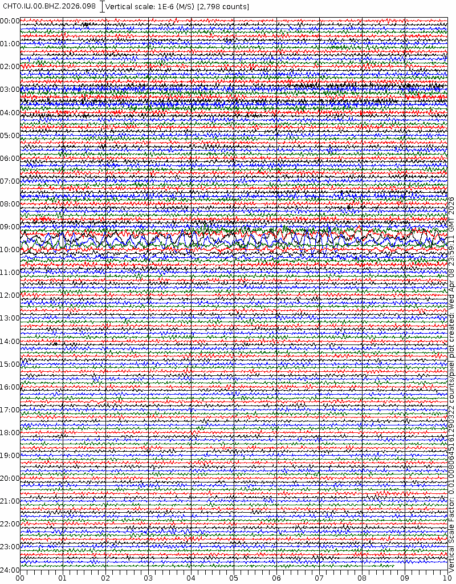 • 06:58 กราฟแผ่นดินไหวชนิดที่ใช้ดูเวลาเกิดเหตุเป็นหลัก แสดงภาพตามแนวตั้ง (BHZ) จากสถานีเครือข่าย IRIS สาขาเชียงใหม่ (CHTO) จาก 07:00 เช้าเมื่อวานนี้จนถึงเวลานี้ เส้นกราฟตามแนวนอนเส้นละ 10 นาที แยกสีเส้นกราฟเพื่อให้ดูได้ง่าย ช่องแบ่งตามแนวตั้งช่องละ 1 นาที