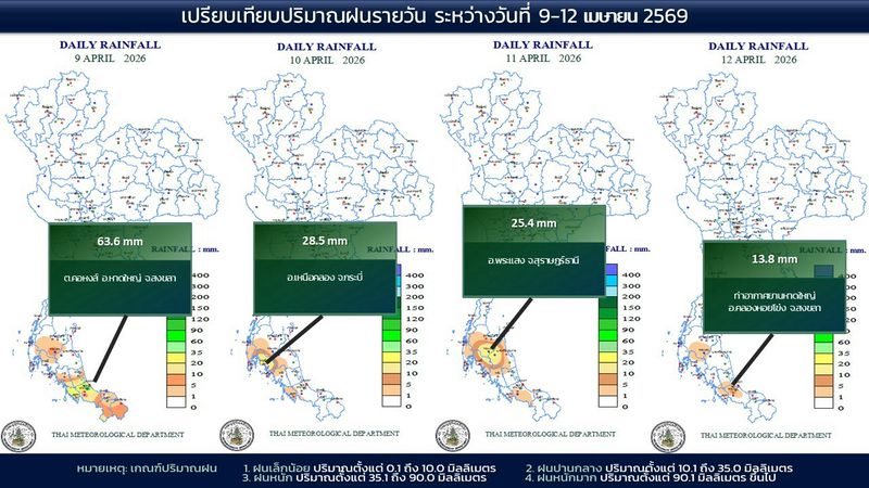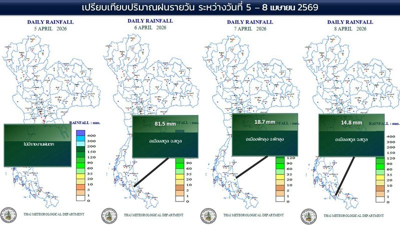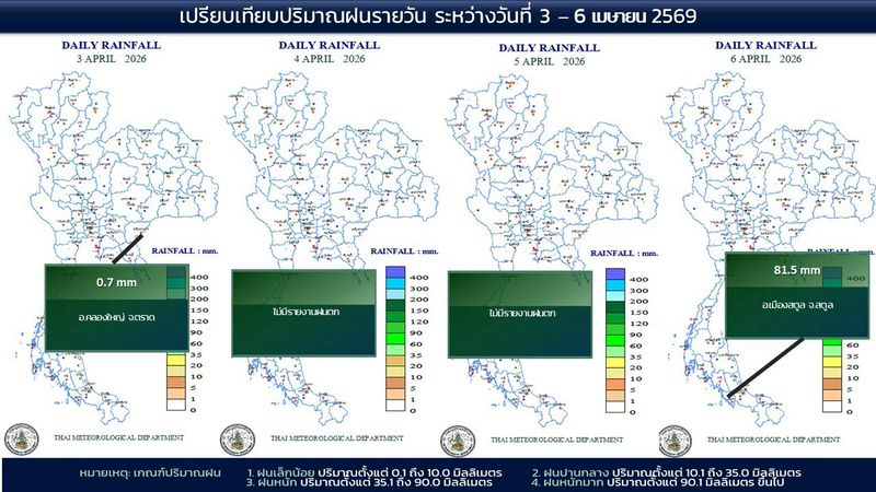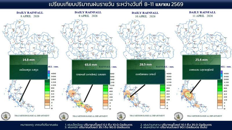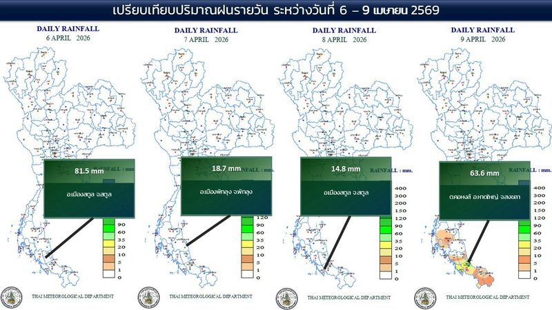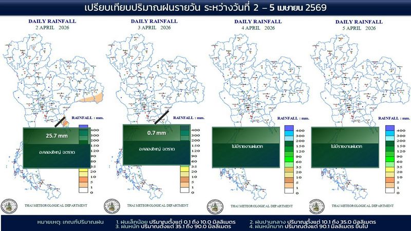• 07:00 แผนที่เปรียบเทียบพื้นที่ที่มีปริมาณฝนสูงสุดในประเทศไทยรอบ 24 ชั่วโมงย้อนหลัง 4 วัน