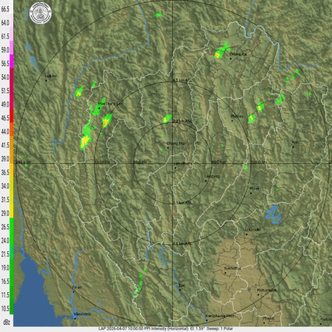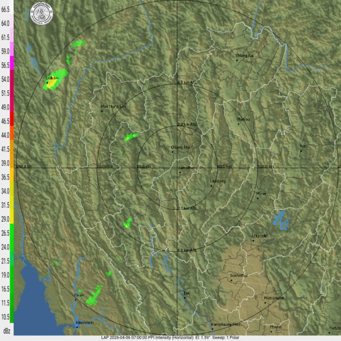 • 18:15 เรดาร์ตรวจอากาศ TMD แบบเคลื่อนไหว รัศมี 240 กม. ศูนย์กลางที่ จ.ลำพูน แสดงกลุ่มฝนตลอด 1 ชั่วโมง 15 นาที ที่ผ่านมา