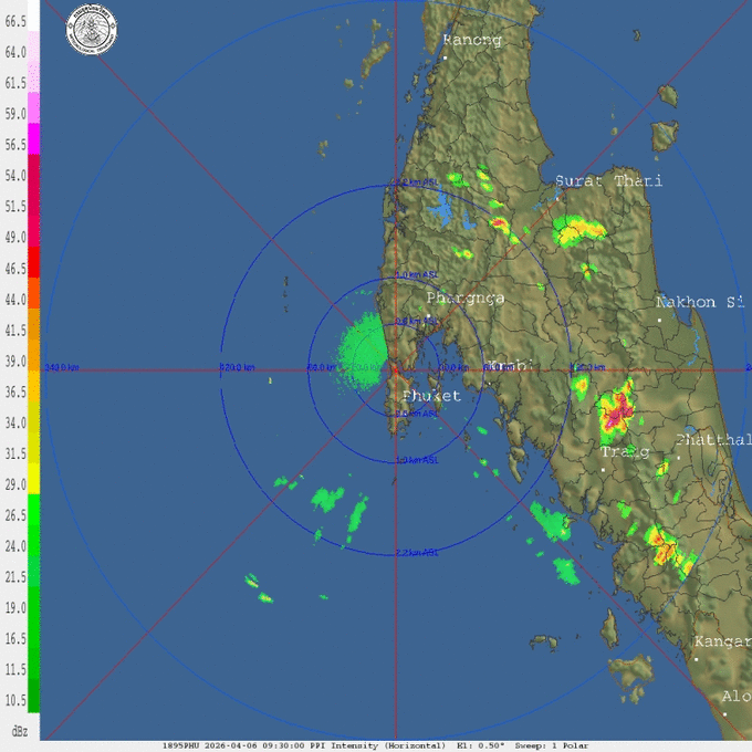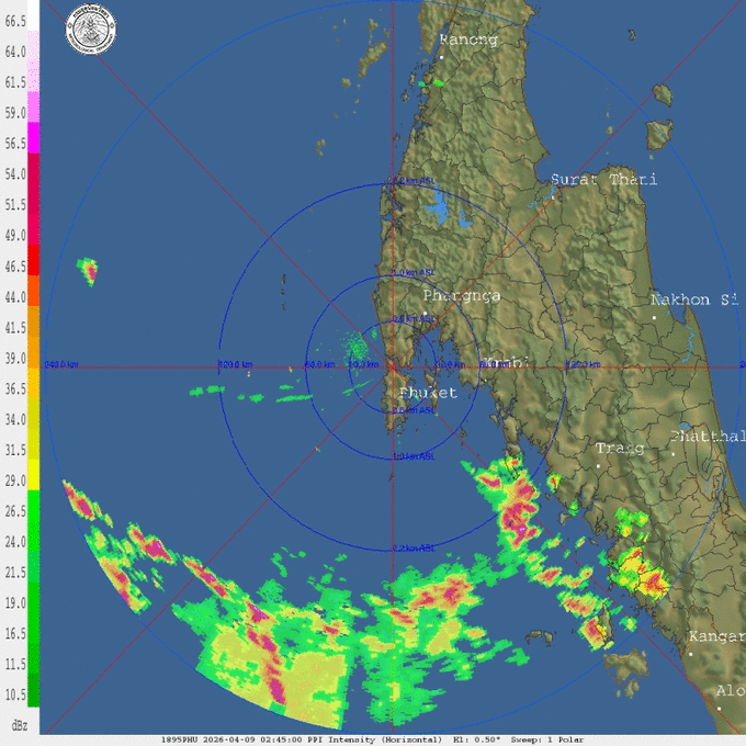 • 11:00 เรดาร์ตรวจอากาศ TMD แบบเคลื่อนไหว รัศมี 240 กม. ศูนย์กลางที่ จ.ภูเก็ต แสดงกลุ่มฝนตลอด 1 ชั่วโมง 15 นาที ที่ผ่านมา