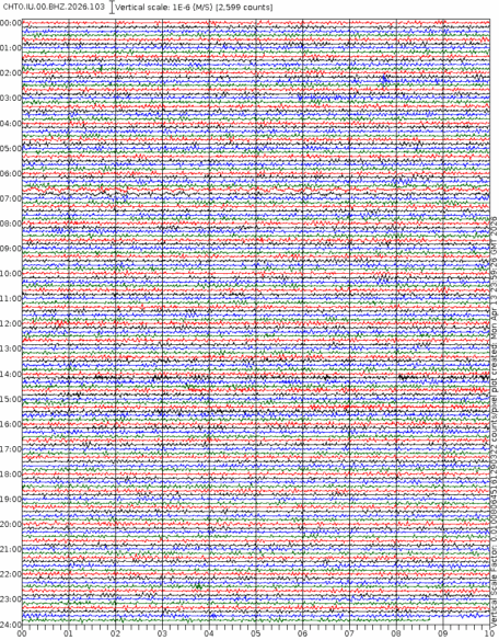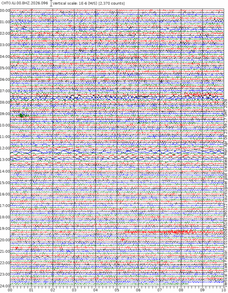 • 06:57 กราฟแผ่นดินไหวชนิดที่ใช้ดูเวลาเกิดเหตุเป็นหลัก แสดงภาพตามแนวตั้ง (BHZ) จากสถานีเครือข่าย IRIS สาขาเชียงใหม่ (CHTO) จาก 07:00 เช้าเมื่อวานนี้จนถึงเวลานี้ เส้นกราฟตามแนวนอนเส้นละ 10 นาที แยกสีเส้นกราฟเพื่อให้ดูได้ง่าย ช่องแบ่งตามแนวตั้งช่องละ 1 นาที