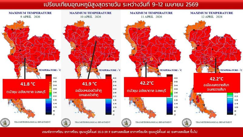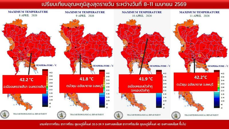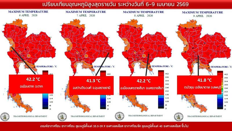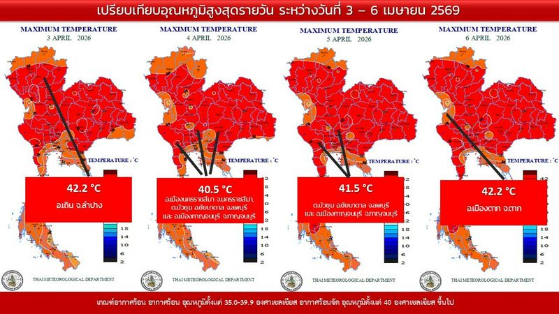 • 16:00 แผนที่เปรียบเทียบอุณหภูมิสูงสุดในประเทศไทยรอบ 24 ชั่วโมงย้อนหลัง 4 วัน