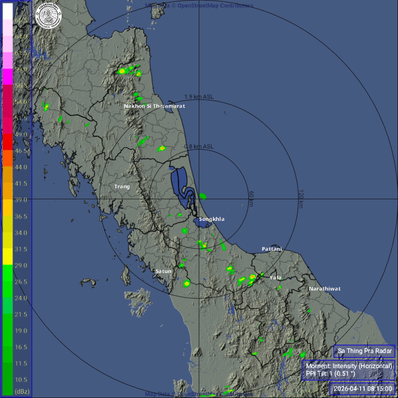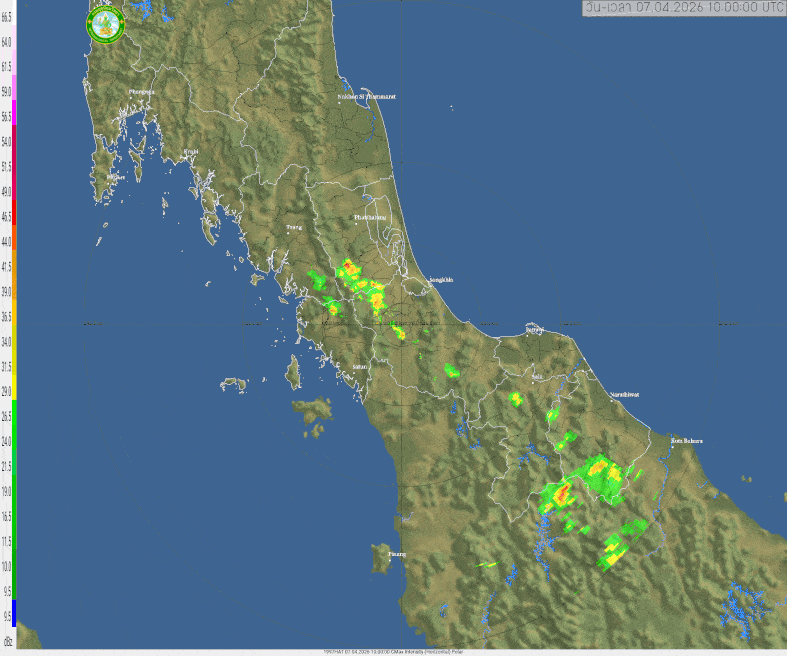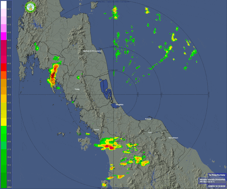 • 18:15 เรดาร์ตรวจอากาศ TMD แบบเคลื่อนไหว รัศมี 240 กม. ศูนย์กลางที่ หาดใหญ่ แสดงกลุ่มฝนตลอด 1 ชั่วโมง 15 นาที ที่ผ่านมา