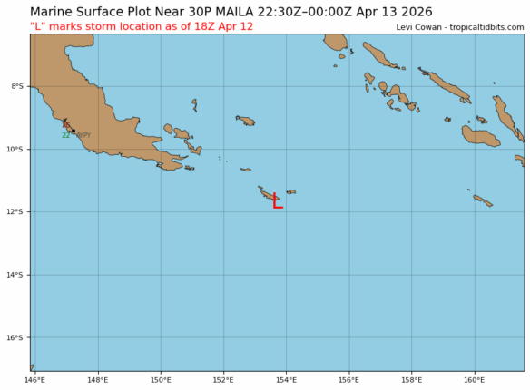 • 14:30 พายุดีเปรสชัน 30P ที่ก่อตัวขึ้นใหม่ในทะเลโซโลมอน ทวีกำลังเป็นพายุโซนร้อน ได้ชื่อเรียกว่า Maila ทวีกำลังต่อเนื่องจนล่าสุดกลายเป็นพายุไซโคลน ความเร็วลมเทียบเท่าระดับ 2 ตามมาตราเฮอริเคนแซฟเฟอร์-ซิมป์สัน แนวโน้มขึ้นฝั่งปาปัวนิวกินี