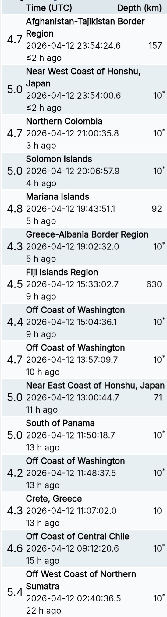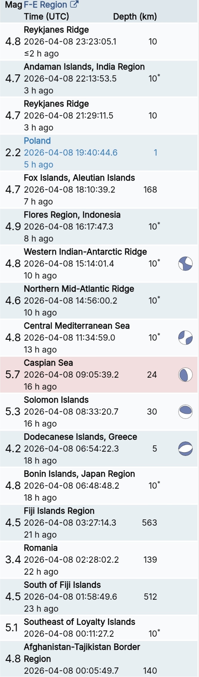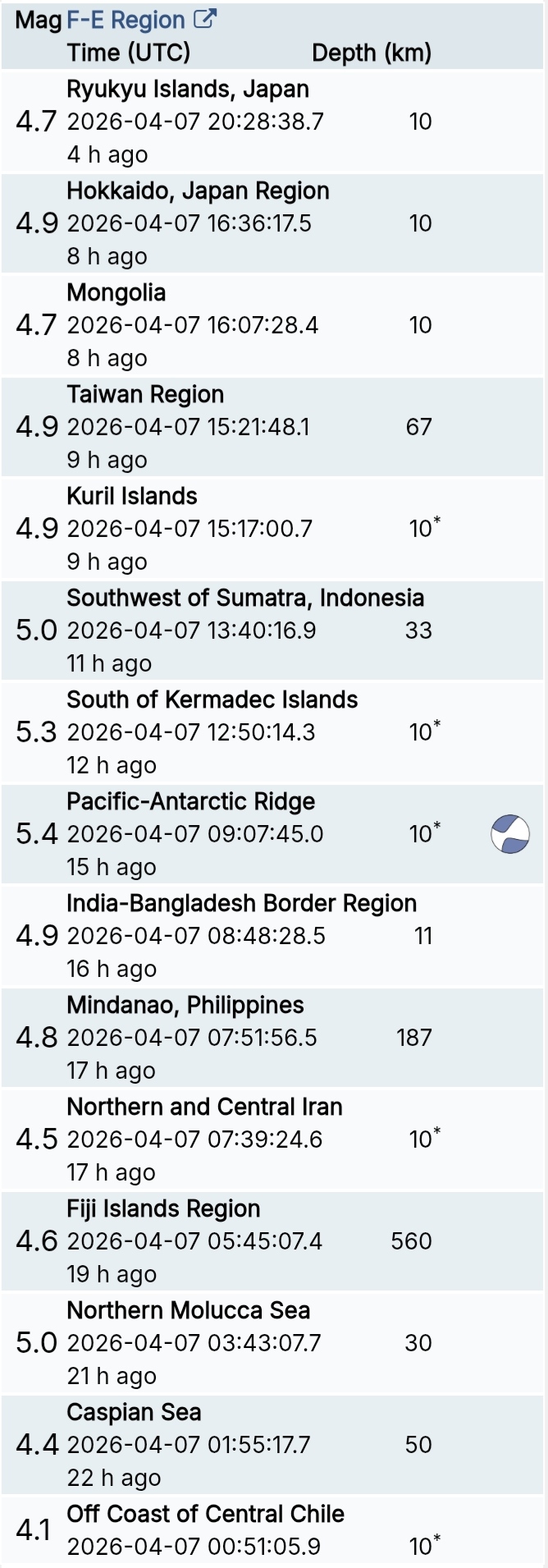 สรุปรายการแผ่นดินไหวและอาฟเตอร์ช็อกทั่วโลกจาก Geofon เยอรมนี ช่วง 07:00 เมื่อวานนี้ ถึง 07:00 เช้าวันนี้ (เวลาในตารางเป็น UTC ต้องบวก 7 ชั่วโมงให้เป็นเวลาไทย)