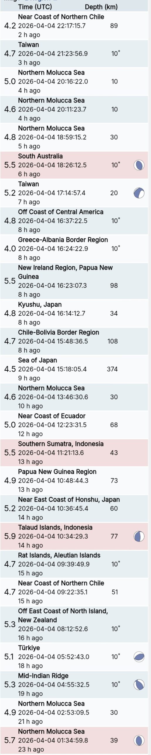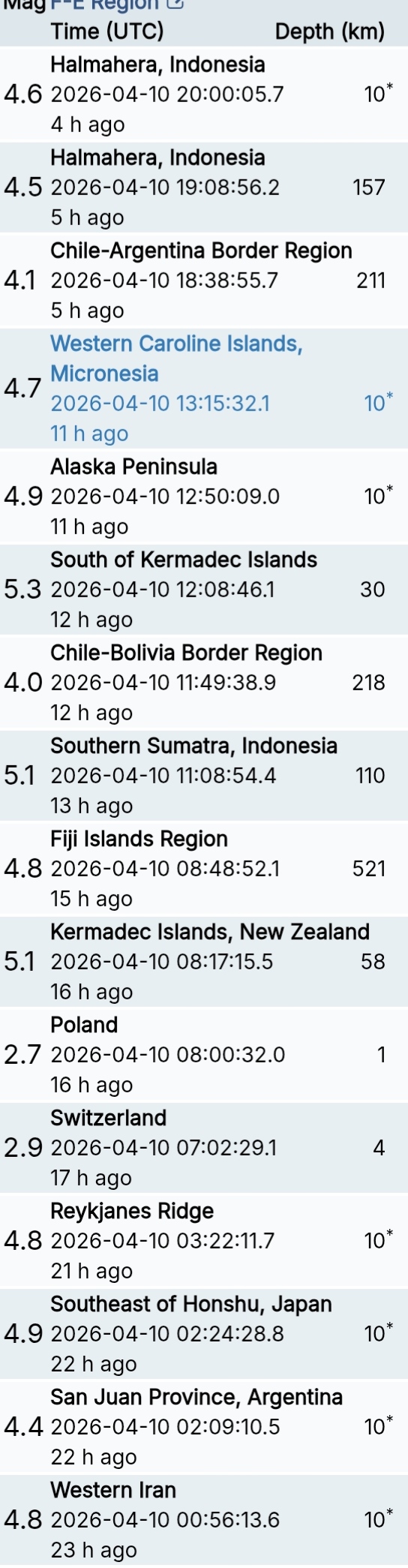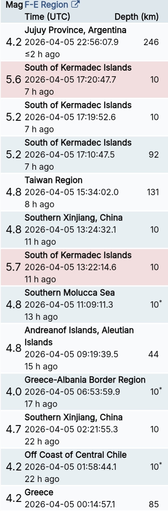 สรุปรายการแผ่นดินไหวและอาฟเตอร์ช็อกทั่วโลกจาก Geofon เยอรมนี ช่วง 07:00 เมื่อวานนี้ ถึง 07:00 เช้าวันนี้ (เวลาในตารางเป็น UTC ต้องบวก 7 ชั่วโมงให้เป็นเวลาไทย)