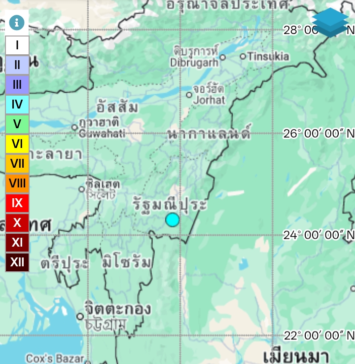 • 05:13 แผ่นดินไหวขนาด 3.6 ลึก 50 กม.พิกัด 24.307°N 93.839°E รัฐมณีปุระ ประเทศอินเดีย