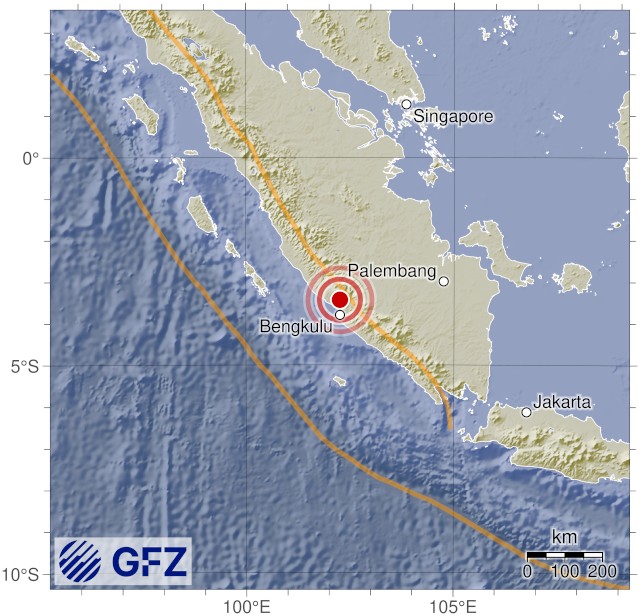 • 18:08 แผ่นดินไหวขนาด 5.2 (mb) ลึก 111 กม.พิกัด 102.26°E 3.43°S จังหวัดเบงกูลู บนเกาะสุมาตรา ประเทศอินโดนีเซีย