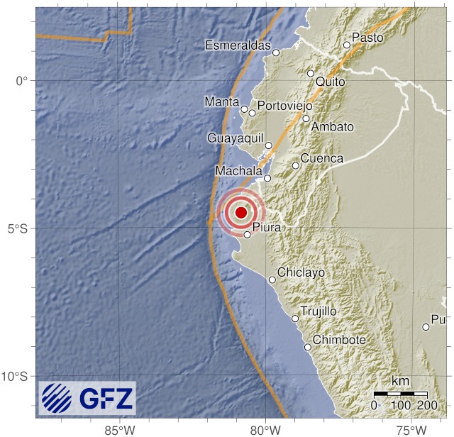 • 20:44 แผ่นดินไหวขนาด 4.8 (mb) ลึก 10 กม.พิกัด 80.84°W 4.50°S เขตมาร์กาเบลิกา จังหวัดซุลลานาภูมิภาคปิวรา ประเทศเปรู