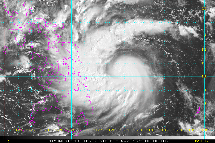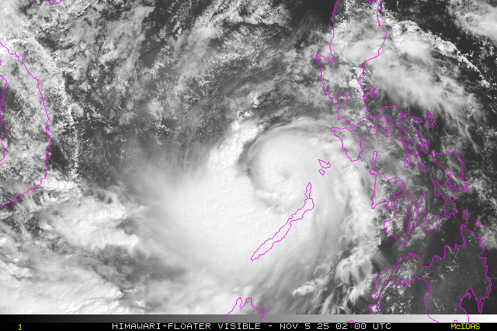 - 14:00 ภาพดาวเทียมแบบเคลื่อนไหวในแสงธรรมชาติของพายุไต้ฝุ่น “คัลแมกี” Kalmaegi 갈매기 ในทะเลฟิลิปปินส์