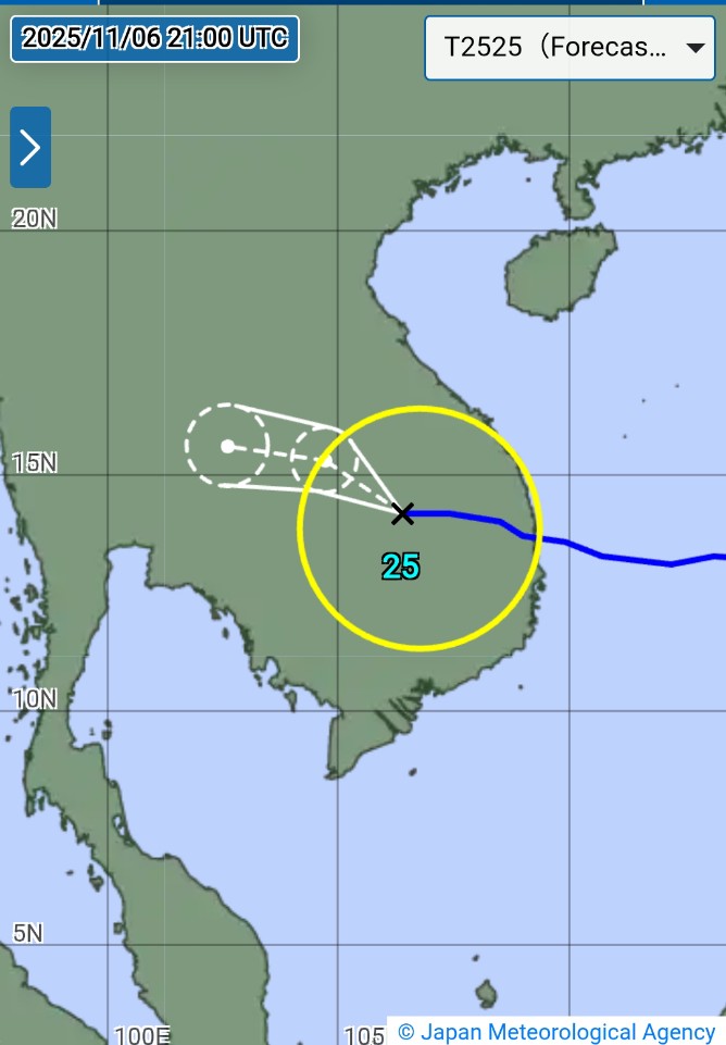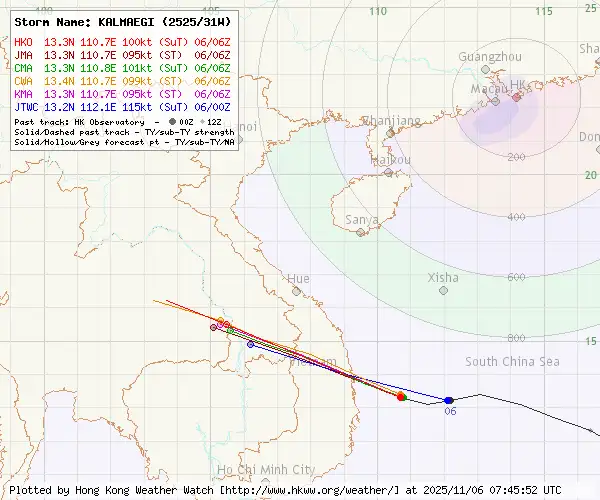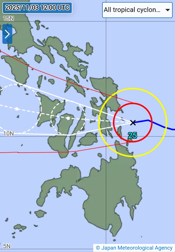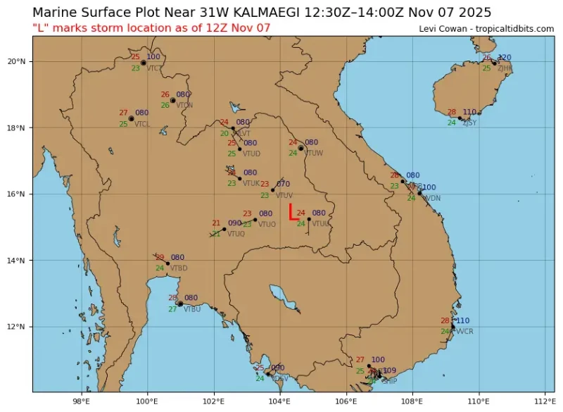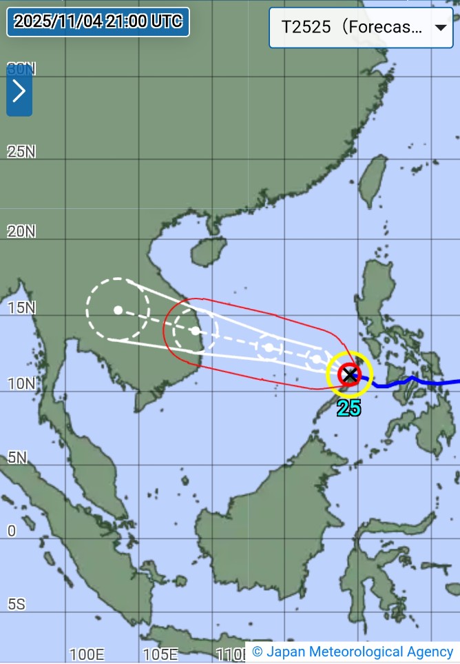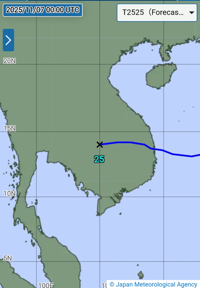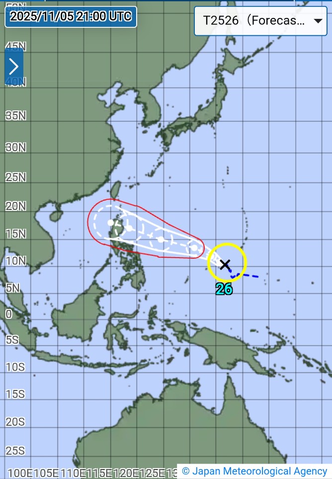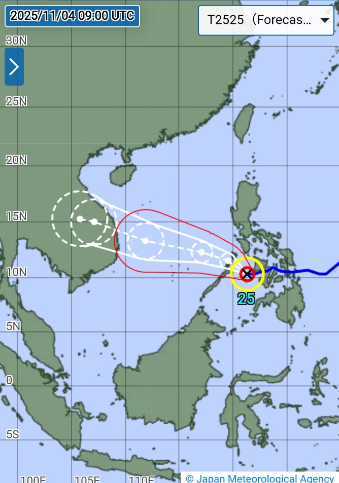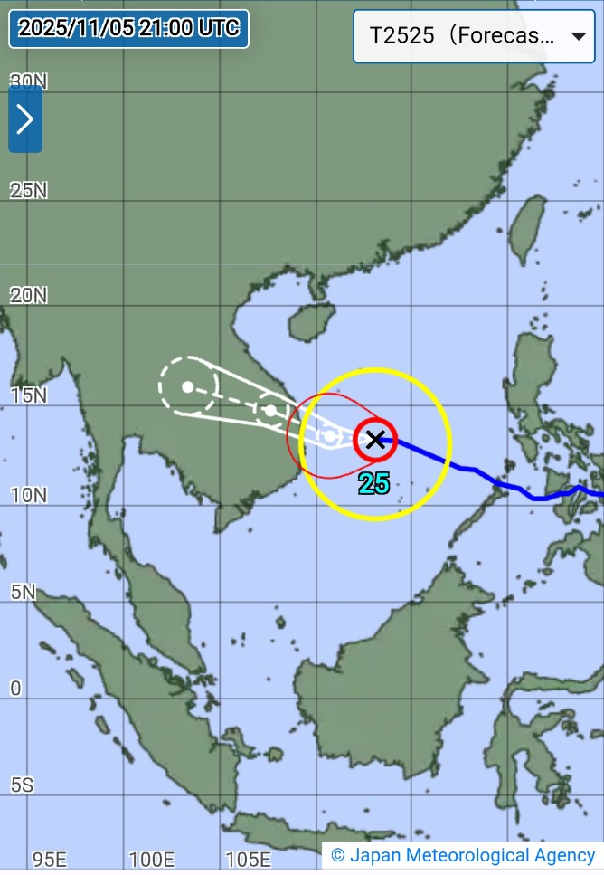 - 10:00 พายุโซนร้อนกำลังแรง “คัลแมกี” Kalmaegi 갈매기 ในทะเลฟิลิปปินส์ มีความเร็วลมใกล้ศูนย์กลางพายุเพิ่มขึ้นเป็น 65 น็อต กลายสภาพเป็นพายุไต้ฝุ่น พิกัดล่าสุดอยู่ที่ 10.3°N 128.0°E แนวโน้มขึ้นฝั่งบริเวณเกาะเลเตของฟิลิปปินส์คืนนี้ จากนั้นจะเคลื่อนตัวลงทะเลจีนใต้ ตรงมาขึ้นฝั่งบริเวณจังหวัดกว๋างหงายของเวียดนาม ประมาณวันที่ 7 พ.ย.