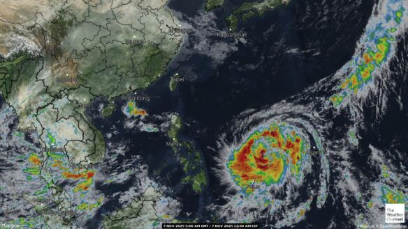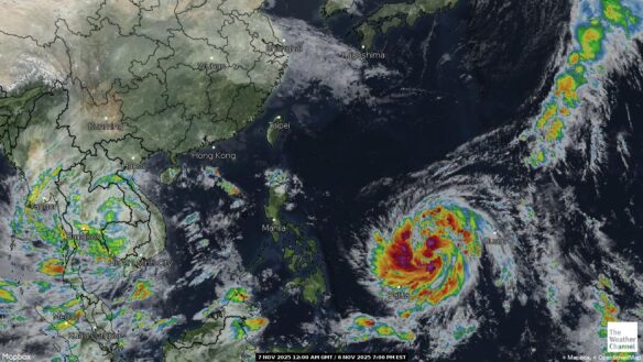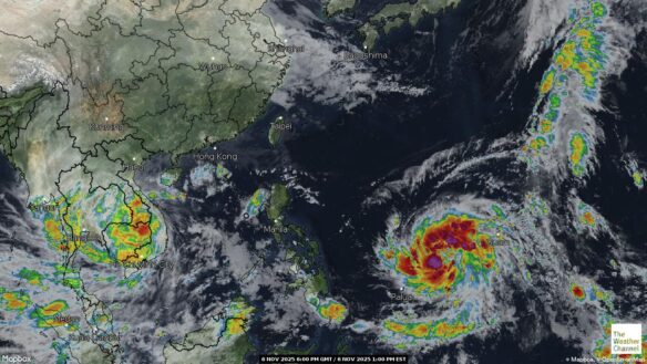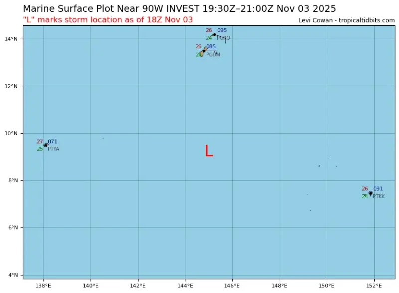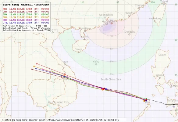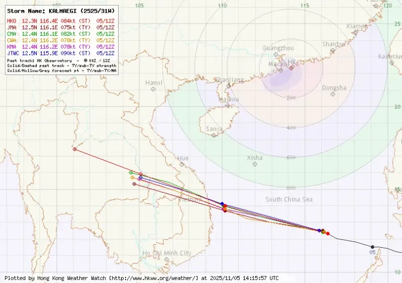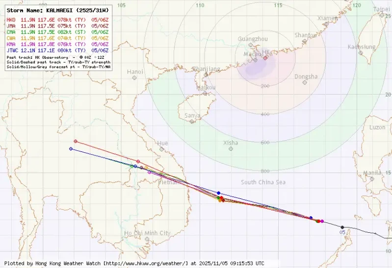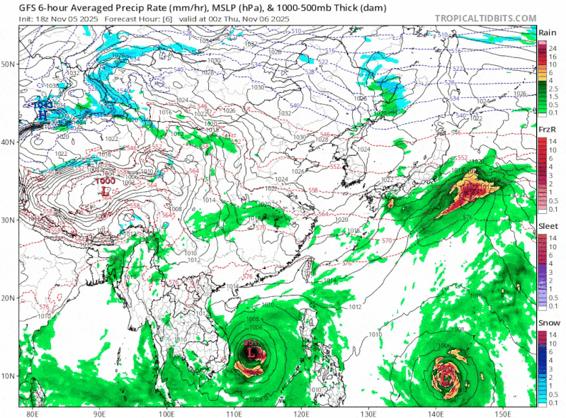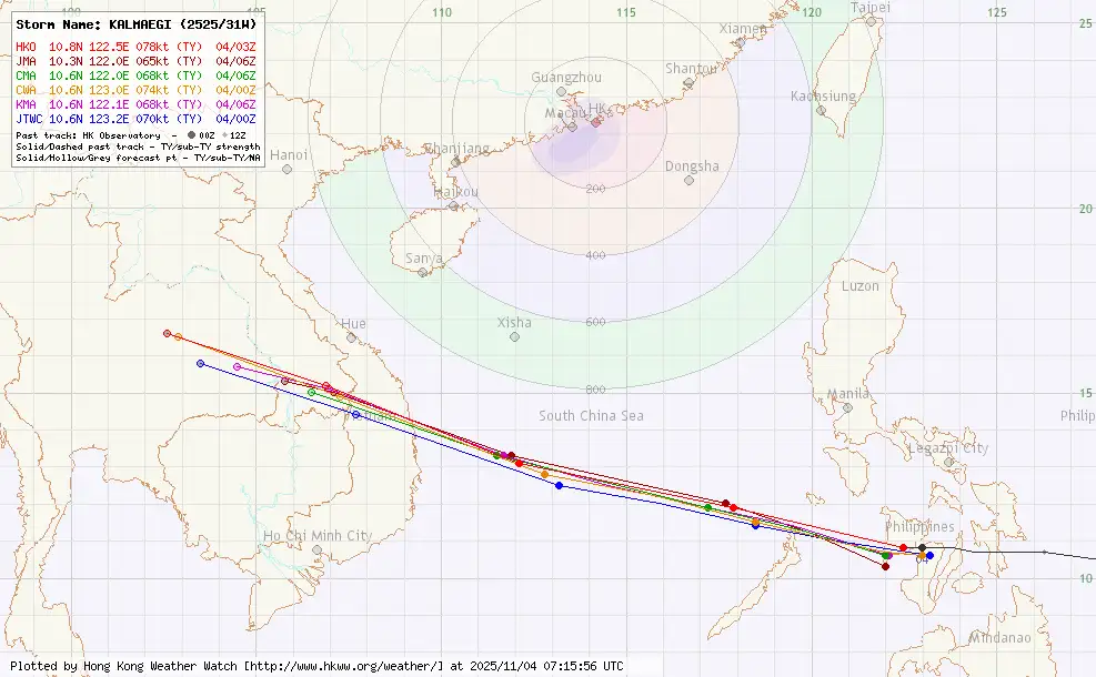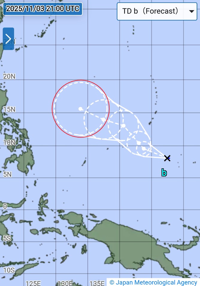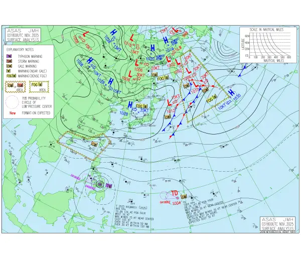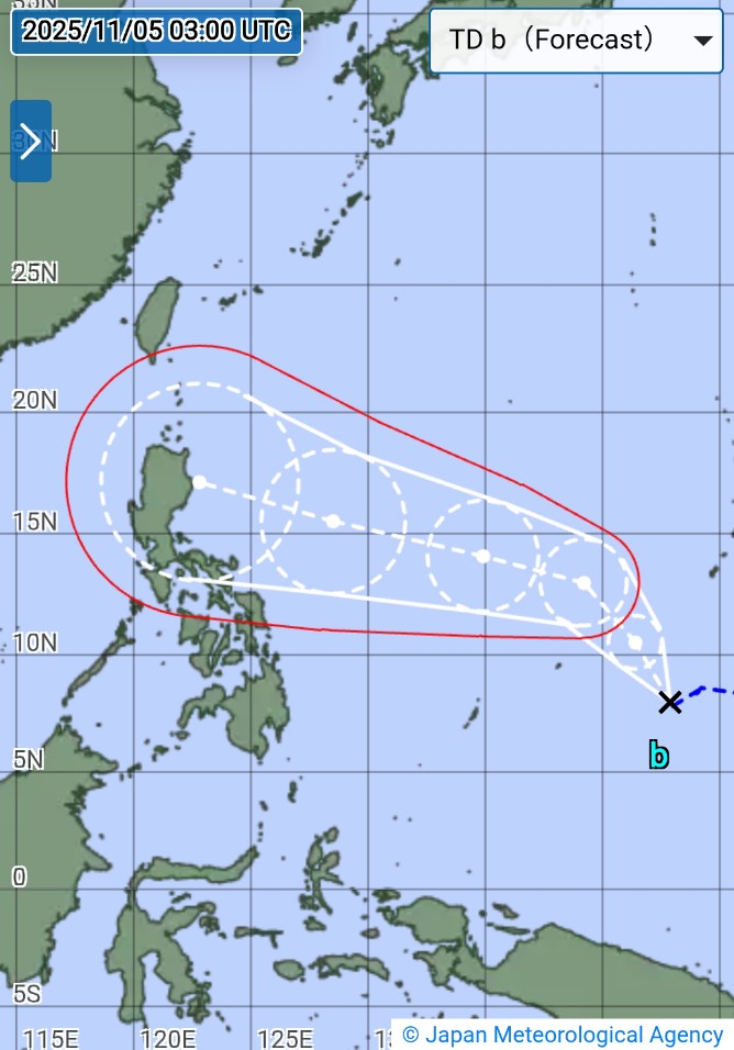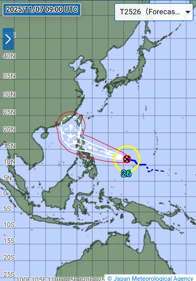 - 10:00 พายุโซนร้อนกำลังแรง “คัลแมกี” Kalmaegi 갈매기 ในทะเลฟิลิปปินส์ มีความเร็วลมใกล้ศูนย์กลางพายุเพิ่มขึ้นเป็น 65 น็อต กลายสภาพเป็นพายุไต้ฝุ่น พิกัดล่าสุดอยู่ที่ 10.3°N 128.0°E แนวโน้มขึ้นฝั่งบริเวณเกาะเลเตของฟิลิปปินส์คืนนี้ จากนั้นจะเคลื่อนตัวลงทะเลจีนใต้ ตรงมาขึ้นฝั่งบริเวณจังหวัดกว๋างหงายของเวียดนาม ประมาณวันที่ 7 พ.ย.