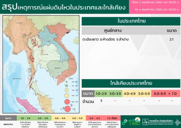 - 06:00 สรุปเหตุการณ์แผ่นดินไหวในประเทศไทยและเพื่อนบ้านตลอด 24 ชั่วโมงที่ผ่านมาที่ตรวจวัดได้โดยกรมอุตุฯ