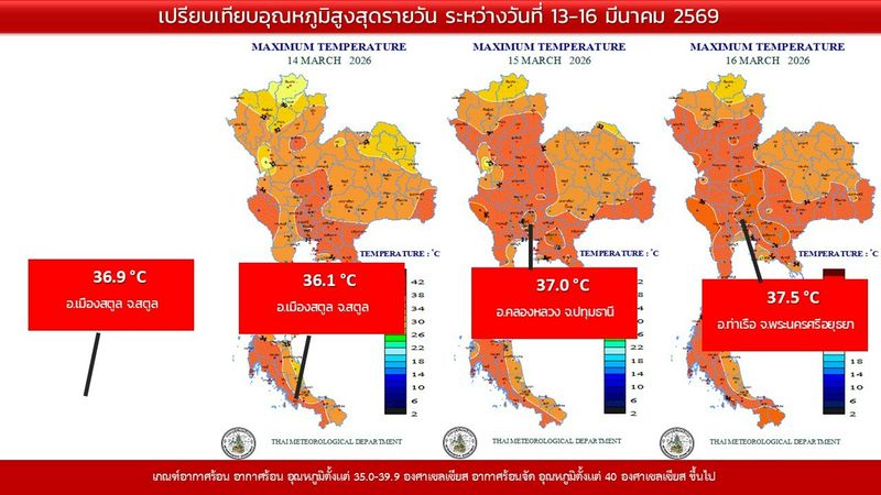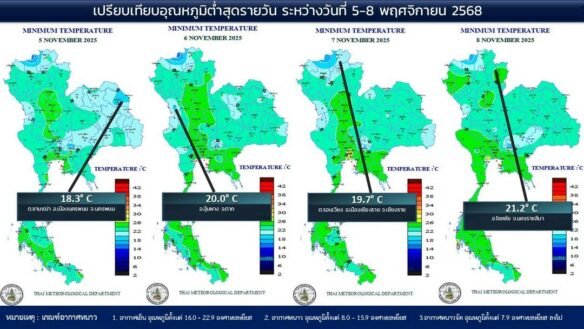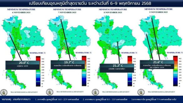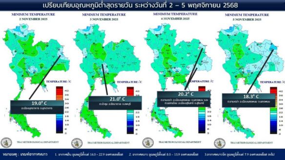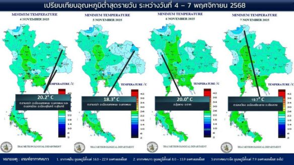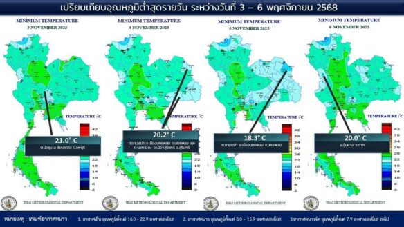 - 07:00 แผนที่เปรียบเทียบอุณหภูมิต่ำสุดในประเทศไทยรอบ 24 ชั่วโมงย้อนหลัง 4 วัน