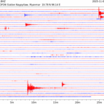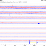 - 07:17 กราฟแผ่นดินไหว ช่วง 24 ชั่วโมงที่ผ่านมา บันทึกจากสถานีกรุงเนปิดอว์ ประเทศพม่า (กราฟนี้เน้นใช้ประโยชน์เรื่องของเวลาที่เกิดแผ่นดินไหว โดยแยกสีเป็นแดงน้ำเงินสีละครึ่งชั่วโมงเพื่อให้ดูง่าย ส่วนเรื่องขนาดแผ่นดินไหว กราฟนี้ไม่อาจใช้ระบุตัวเลขที่ชัดเจน)