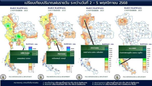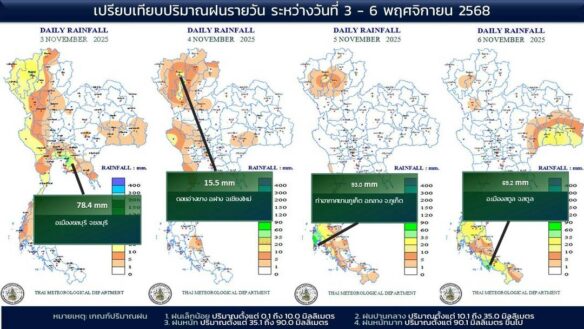 - 07:00 แผนที่เปรียบเทียบปริมาณฝนสูงสุดในประเทศไทยรอบ 24 ชั่วโมงย้อนหลัง 4 วัน