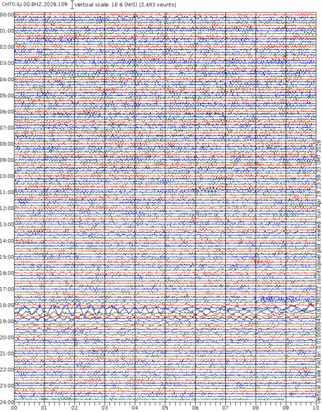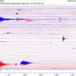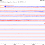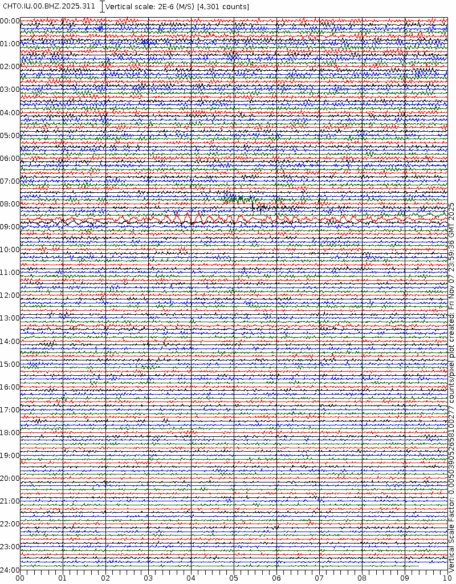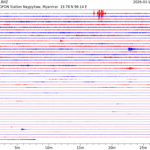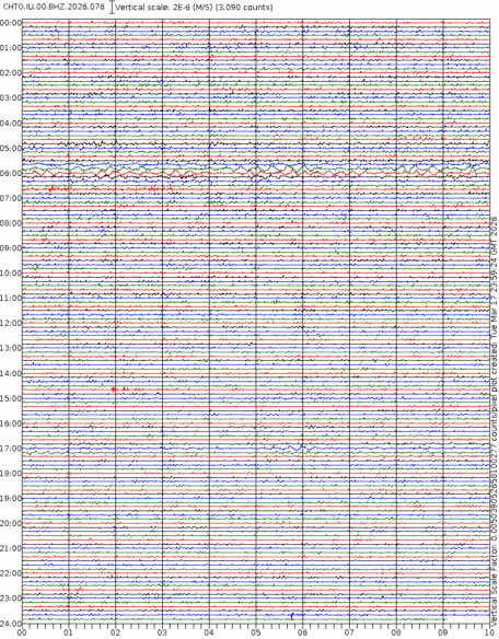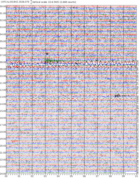 - 06:45 กราฟแผ่นดินไหว ช่วง 24 ชั่วโมงที่ผ่านมา บันทึกจากสถานีกรุงเนปิดอว์ ประเทศพม่า (กราฟนี้เน้นใช้ประโยชน์เรื่องของเวลาที่เกิดแผ่นดินไหว โดยแยกสีเป็นแดงน้ำเงินสีละครึ่งชั่วโมงเพื่อให้ดูง่าย ส่วนเรื่องขนาดแผ่นดินไหว กราฟนี้ไม่อาจใช้ระบุตัวเลขที่ชัดเจน)