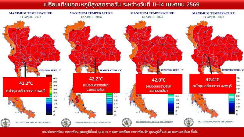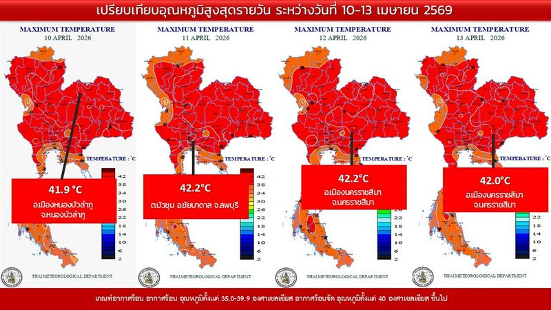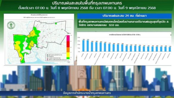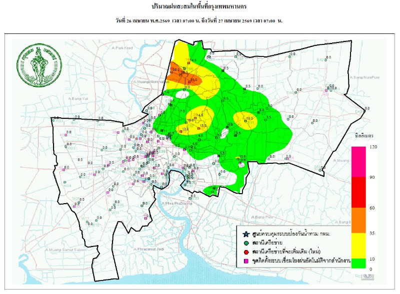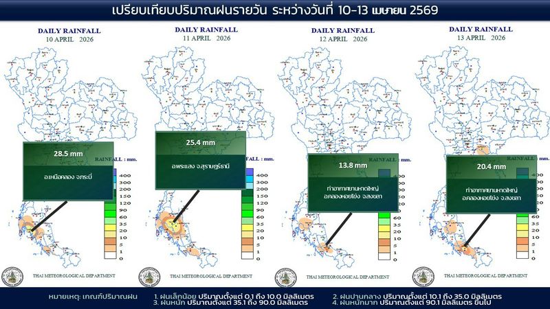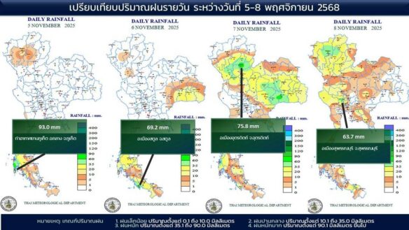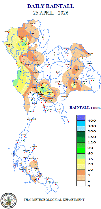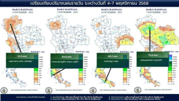 - 07:00 แผนที่เปรียบเทียบพื้นที่ที่มีปริมาณฝนสูงสุดในประเทศไทยรอบ 24 ชั่วโมงย้อนหลัง 4 วัน