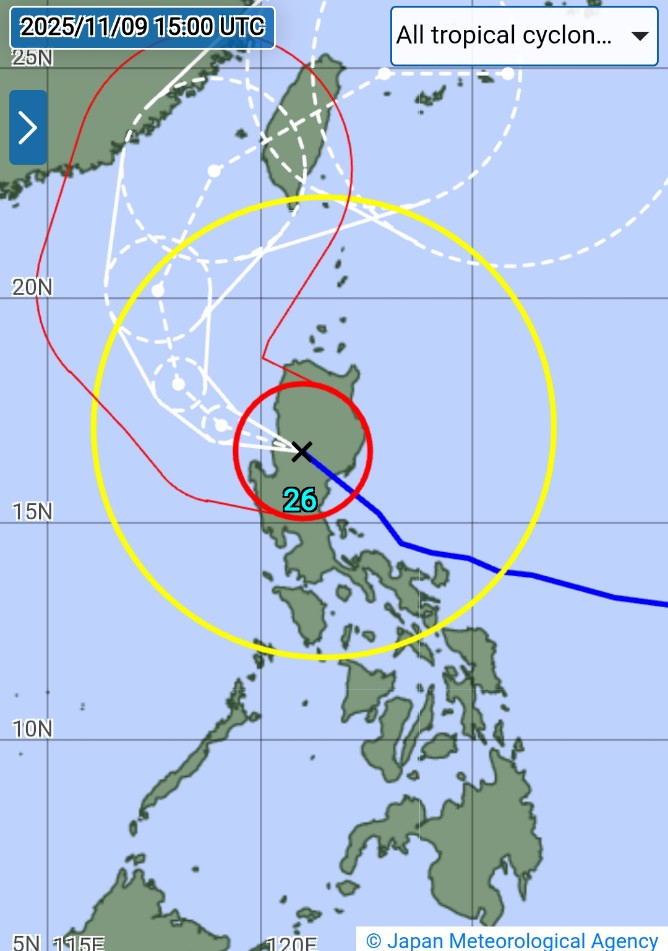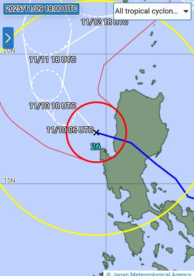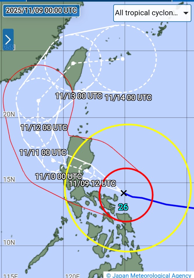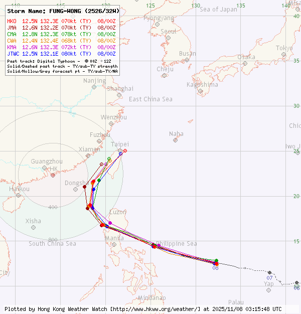 - 01:00 ไต้ฝุ่น “ฟงวอง” Fung-wong 鳳凰 เคลื่อนตัวจากเกาะลูซอนลงสู่ทะเลจีนใต้ พิกัดล่าสุดอยู่ที่ 17.0°N 119.6°E ความเร็วลมใกล้ศูนย์กลางลดลงเหลือ 70 น็อต ความเร็วลมกระโชกสูงสุด 100 น็อต ความกดอากาศ 970 hPa แนวโน้มเคลื่อนตัวขึ้นฝั่งไต้หวัน