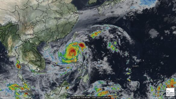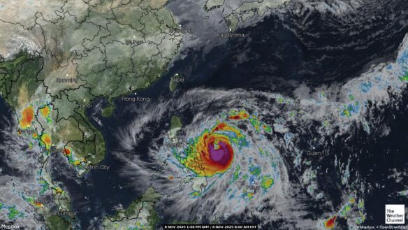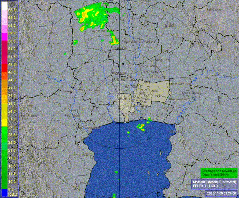 - 02:30 ภาพดาวเทียมย้อมสีจาก TWC แสดงกลุ่มฝนในเอเชียตะวันออกเฉียงใต้และโซนตะวันตกของมหาสมุทรแปซิฟิกเวลานี้