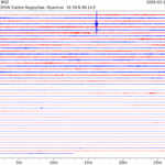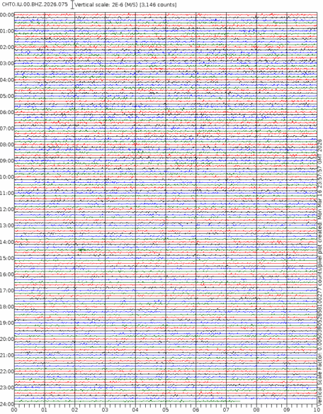 - 06:57 กราฟแผ่นดินไหวชนิดที่ใช้ดูเวลาเกิดเหตุเป็นหลัก แสดงภาพตามแนวตั้ง (BHZ) จากสถานีเครือข่าย IRIS สาขาเชียงใหม่ (CHTO) จาก 07:00 เช้าเมื่อวานนี้จนถึงเวลานี้ เส้นกราฟตามแนวนอนเส้นละ 10 นาที แยกสีเส้นกราฟเพื่อให้ดูได้ง่าย ช่องแบ่งตามแนวตั้งช่องละ 1 นาที