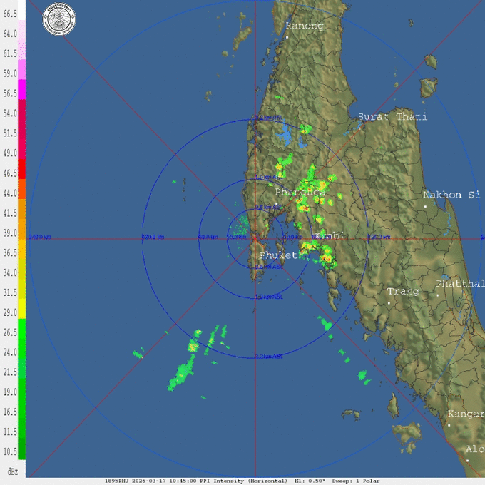 - 15:30 เรดาร์ตรวจอากาศ TMD แบบเคลื่อนไหว รัศมี 240 กม. ศูนย์กลางที่ จ.สมุทรสงคราม แสดงกลุ่มฝนตลอด 1 ชั่วโมง 15 นาที ที่ผ่านมา