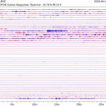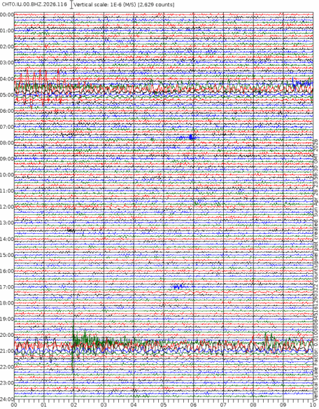 - 06:58 กราฟแผ่นดินไหวชนิดที่ใช้ดูเวลาเกิดเหตุเป็นหลัก แสดงภาพตามแนวตั้ง (BHZ) จากสถานีเครือข่าย IRIS สาขาเชียงใหม่ (CHTO) จาก 07:00 เช้าเมื่อวานนี้จนถึงเวลานี้ เส้นกราฟตามแนวนอนเส้นละ 10 นาที แยกสีเส้นกราฟเพื่อให้ดูได้ง่าย ช่องแบ่งตามแนวตั้งช่องละ 1 นาที