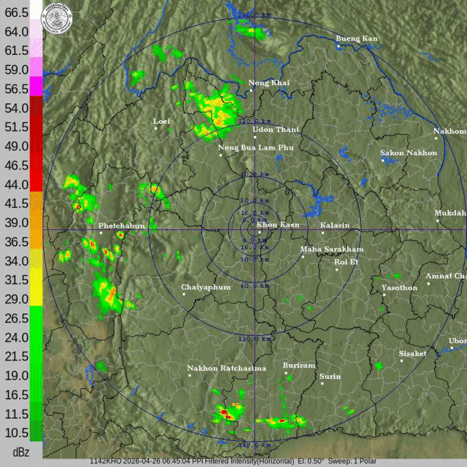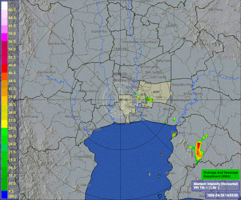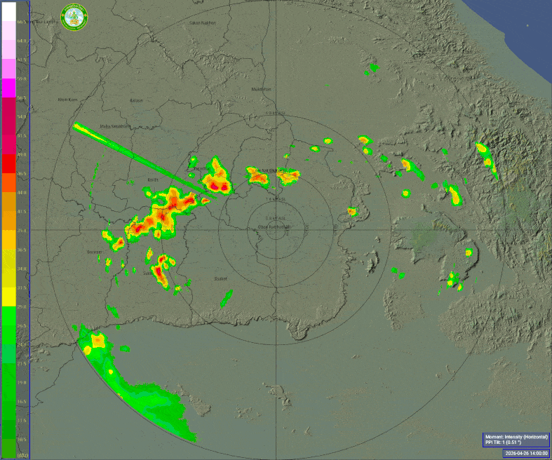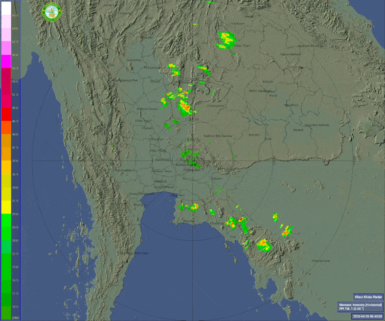 - 14:20 เรดาร์ตรวจอากาศ TMD แบบเคลื่อนไหว รัศมี 480 กม. ศูนย์กลางที่ ยอดเขาเขียว อ.ปากพลี จ.นครนายก แสดงกลุ่มฝนตลอด 1 ชั่วโมง 20 นาที ที่ผ่านมา