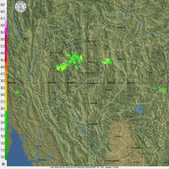 - 14:15 เรดาร์ตรวจอากาศ TMD แบบเคลื่อนไหว รัศมี 240 กม. ศูนย์กลางที่ จ.ลำพูนแสดงกลุ่มฝนตลอด 1 ชั่วโมง 15 นาที ที่ผ่านมา